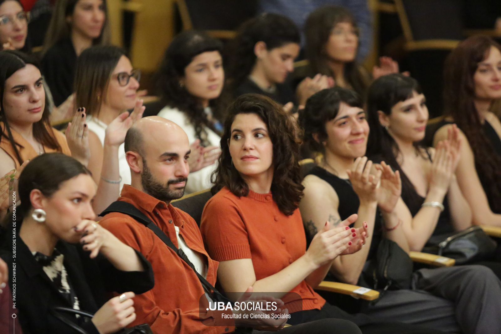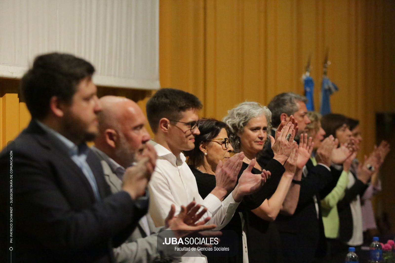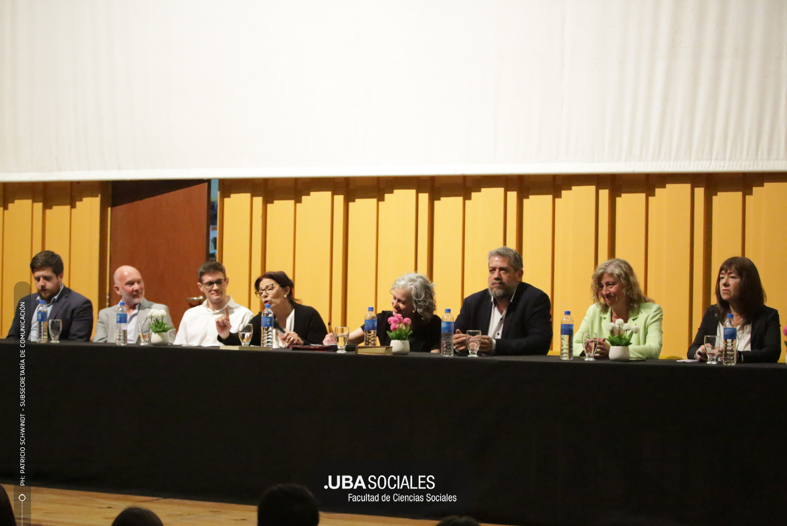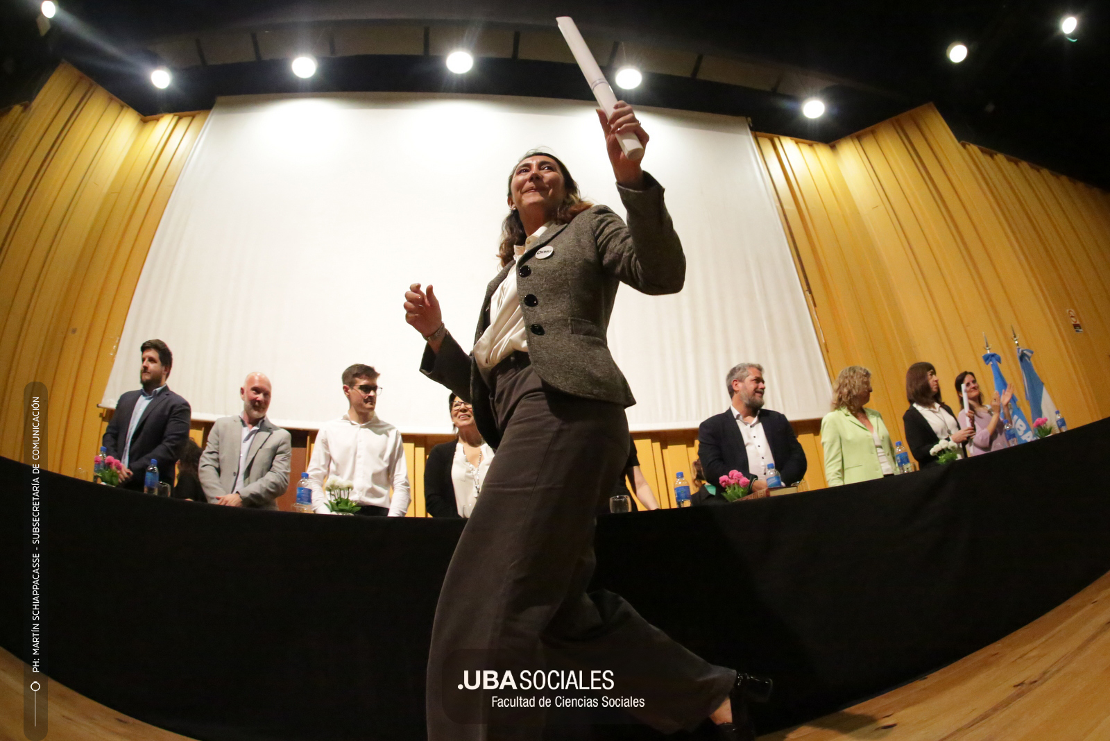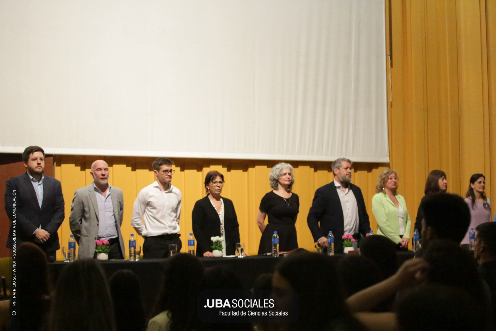 En el escenario la acompañaban el vicedecano Diego de Charras, el secretario académico, Hugo Lewin, la directora de la carrera de Ciencias de la Comunicación, Larisa Kejval, los secretarios académicos de Ciencia Política, Nicolás Zubiría; y de Relaciones del Trabajo, Matías Cao; y su par de Sociología, Sandra Guimenez, y la coordinadora técnica de Trabajo Social, Gisela Mastandrea.