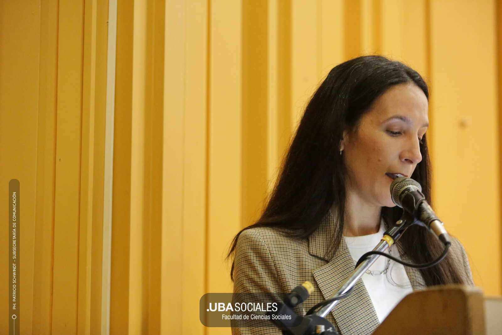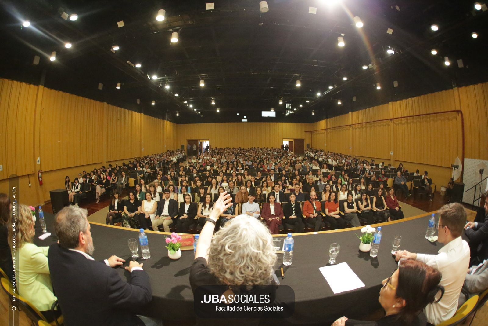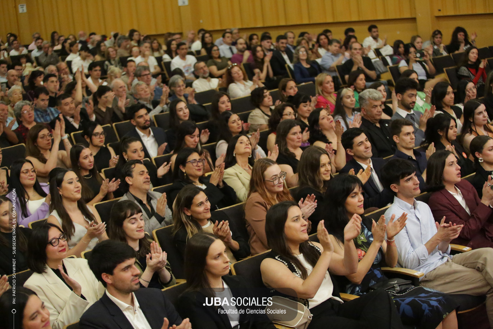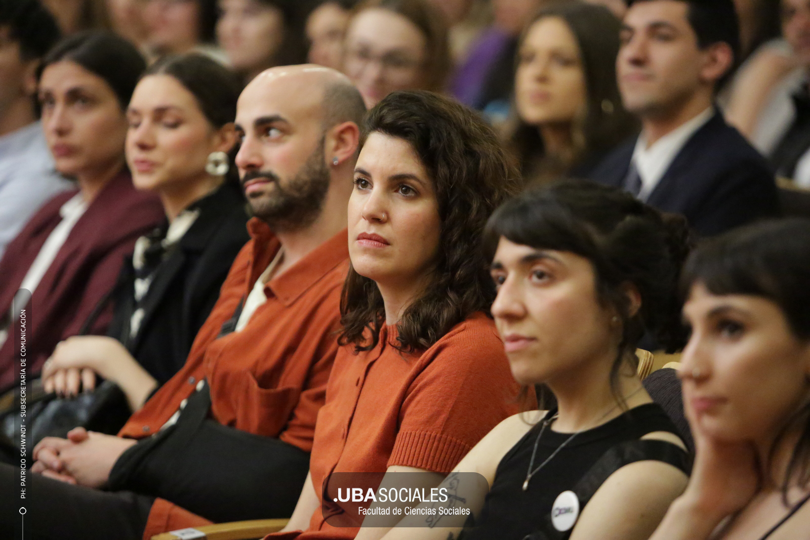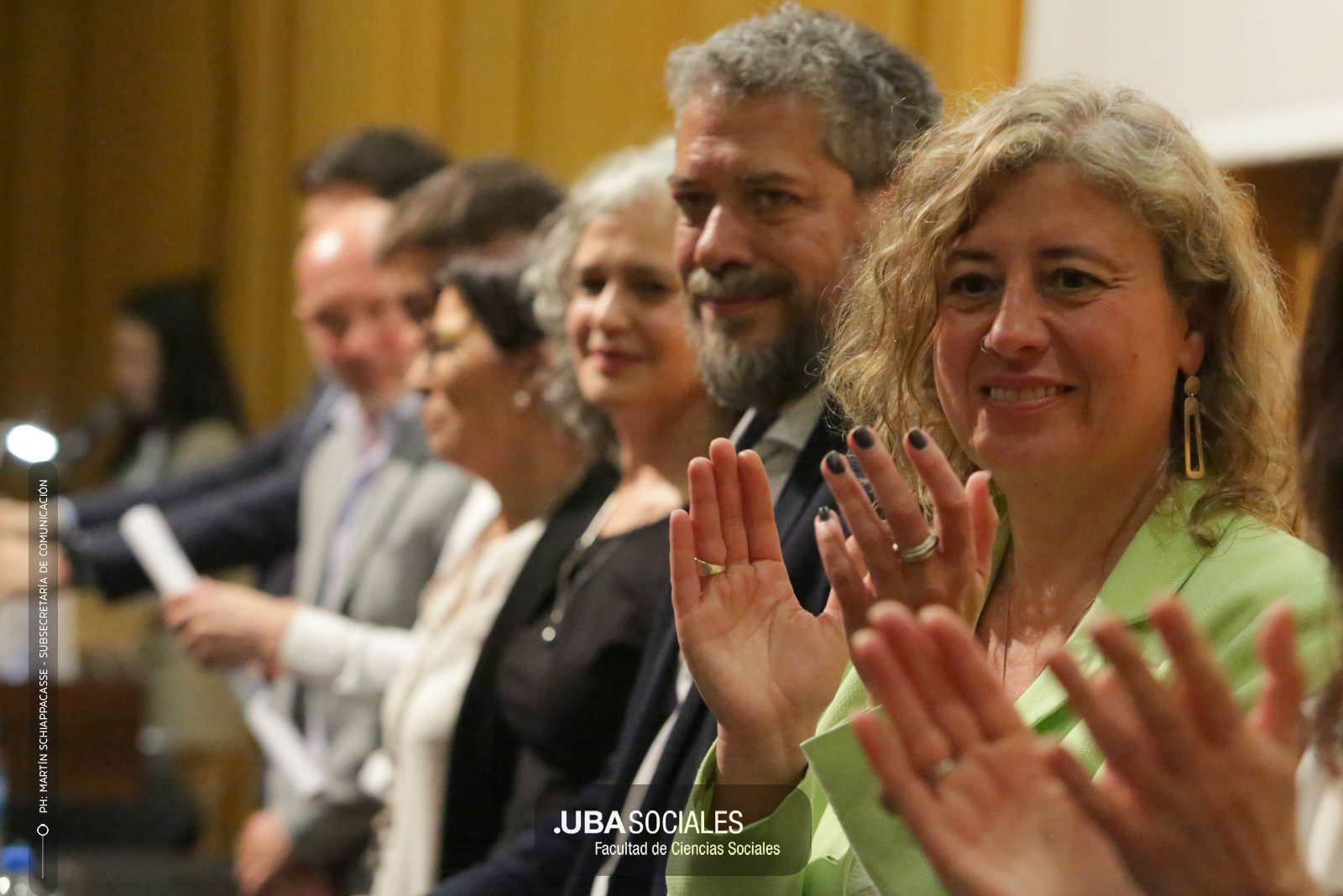 En el escenario la acompañaban el vicedecano Diego de Charras, el secretario académico, Hugo Lewin, la directora de la carrera de Ciencias de la Comunicación, Larisa Kejval, los secretarios académicos de Ciencia Política, Nicolás Zubiría; y de Relaciones del Trabajo, Matías Cao; y su par de Sociología, Sandra Guimenez, y la coordinadora técnica de Trabajo Social, Gisela Mastandrea.