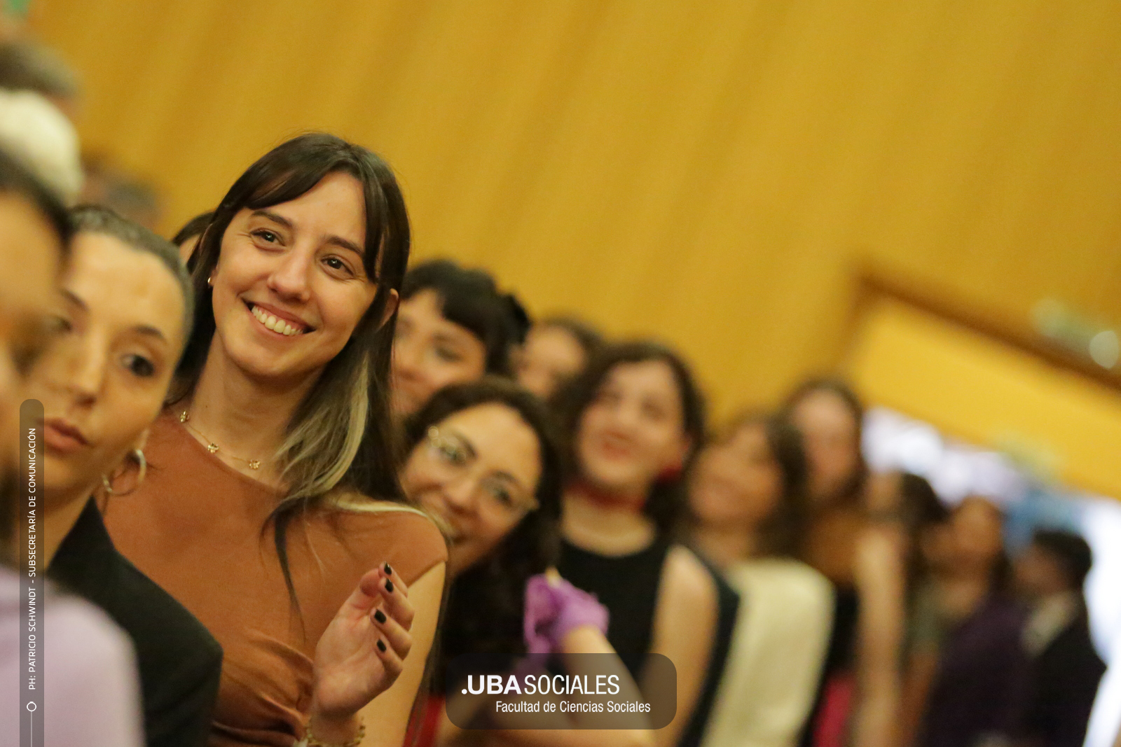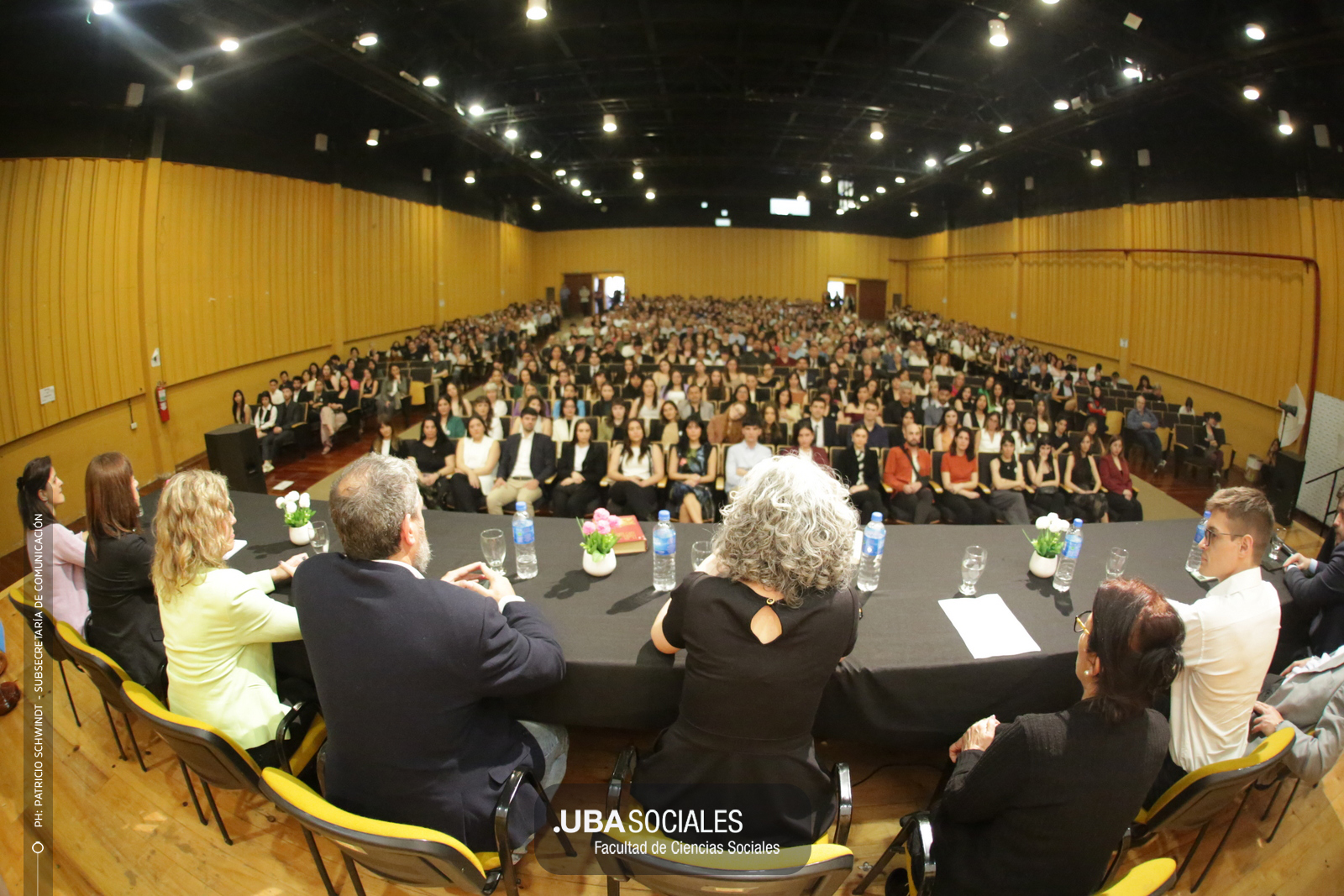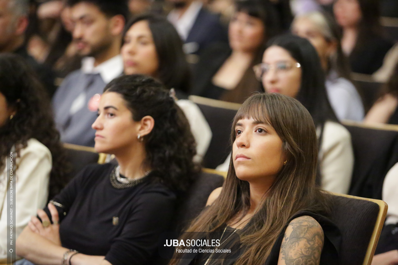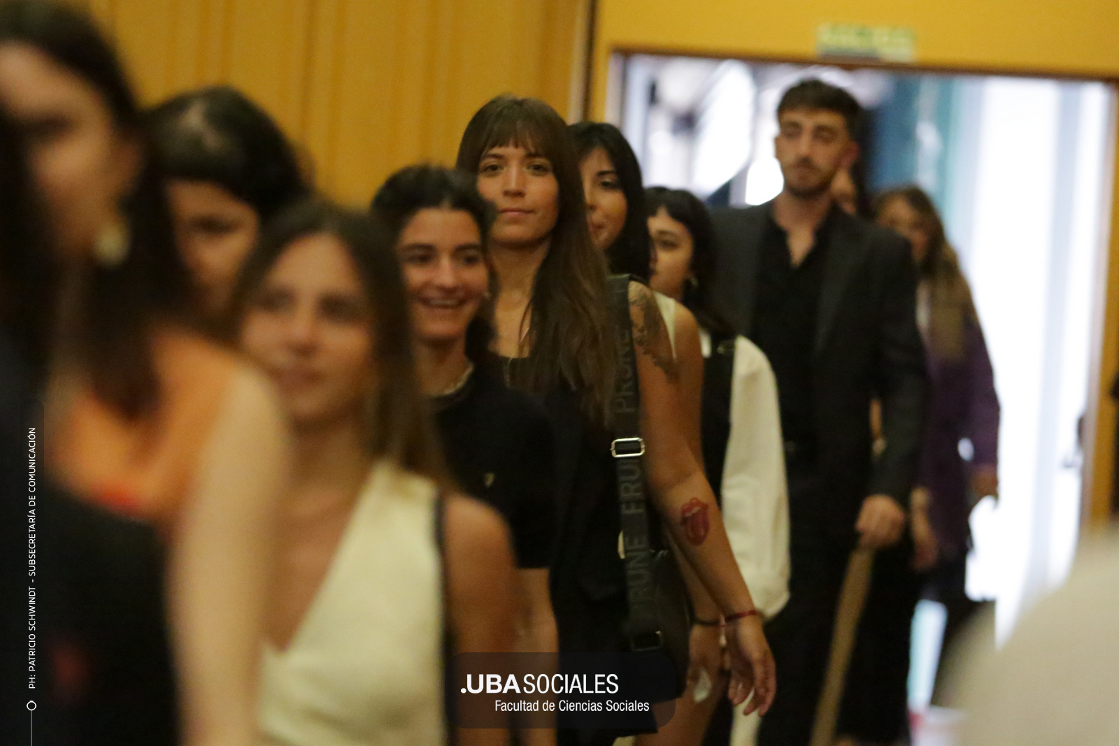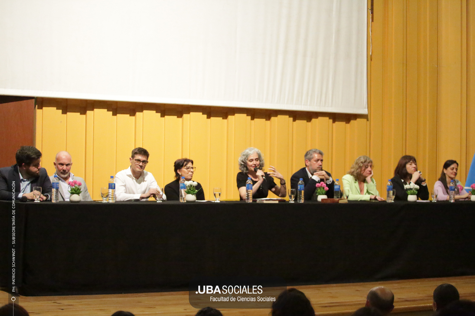 En el escenario la acompañaban el vicedecano Diego de Charras, el secretario académico, Hugo Lewin, la directora de la carrera de Ciencias de la Comunicación, Larisa Kejval, los secretarios académicos de Ciencia Política, Nicolás Zubiría; y de Relaciones del Trabajo, Matías Cao; y su par de Sociología, Sandra Guimenez, y la coordinadora técnica de Trabajo Social, Gisela Mastandrea.
