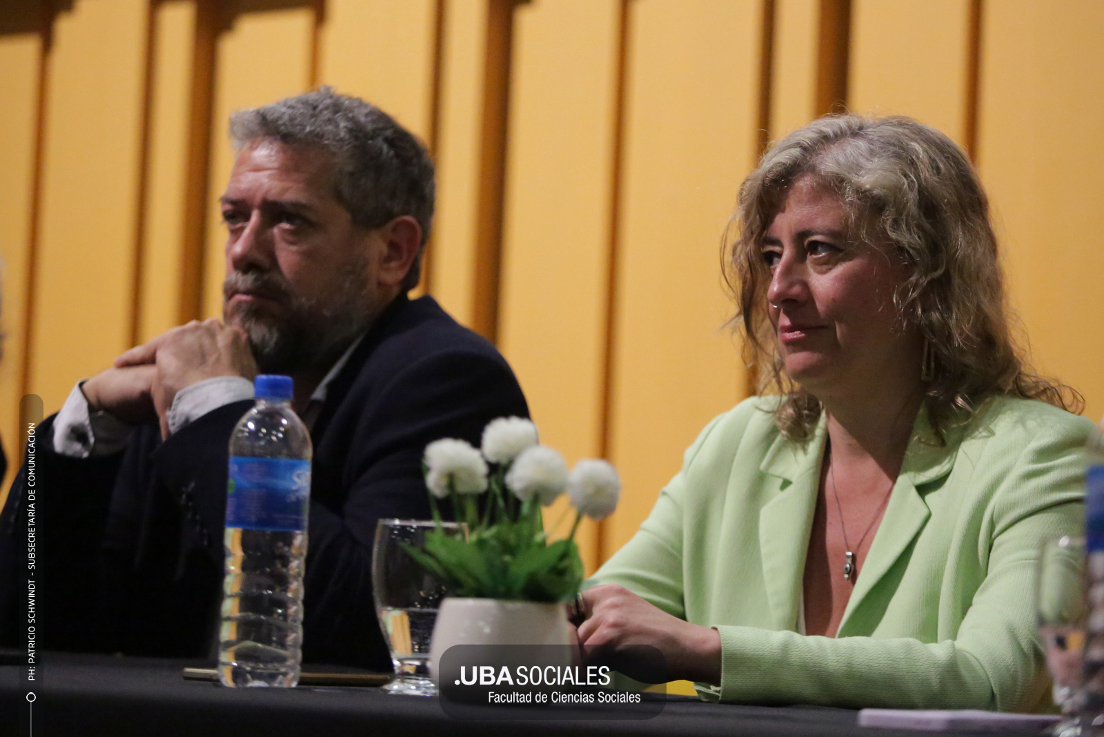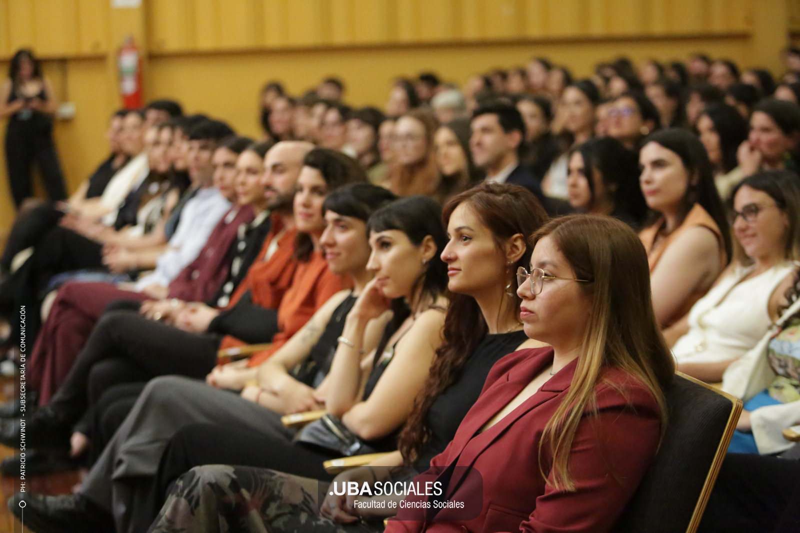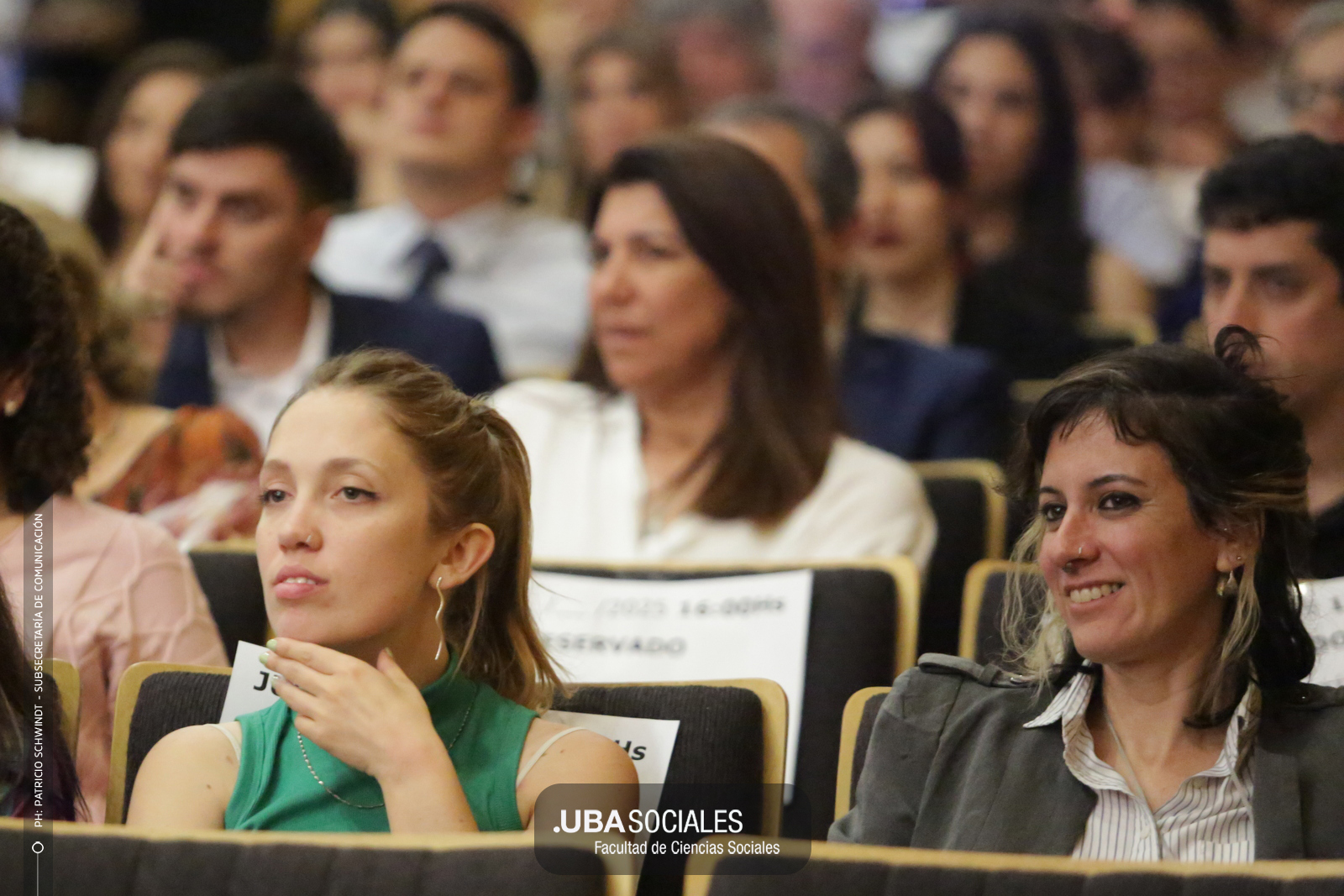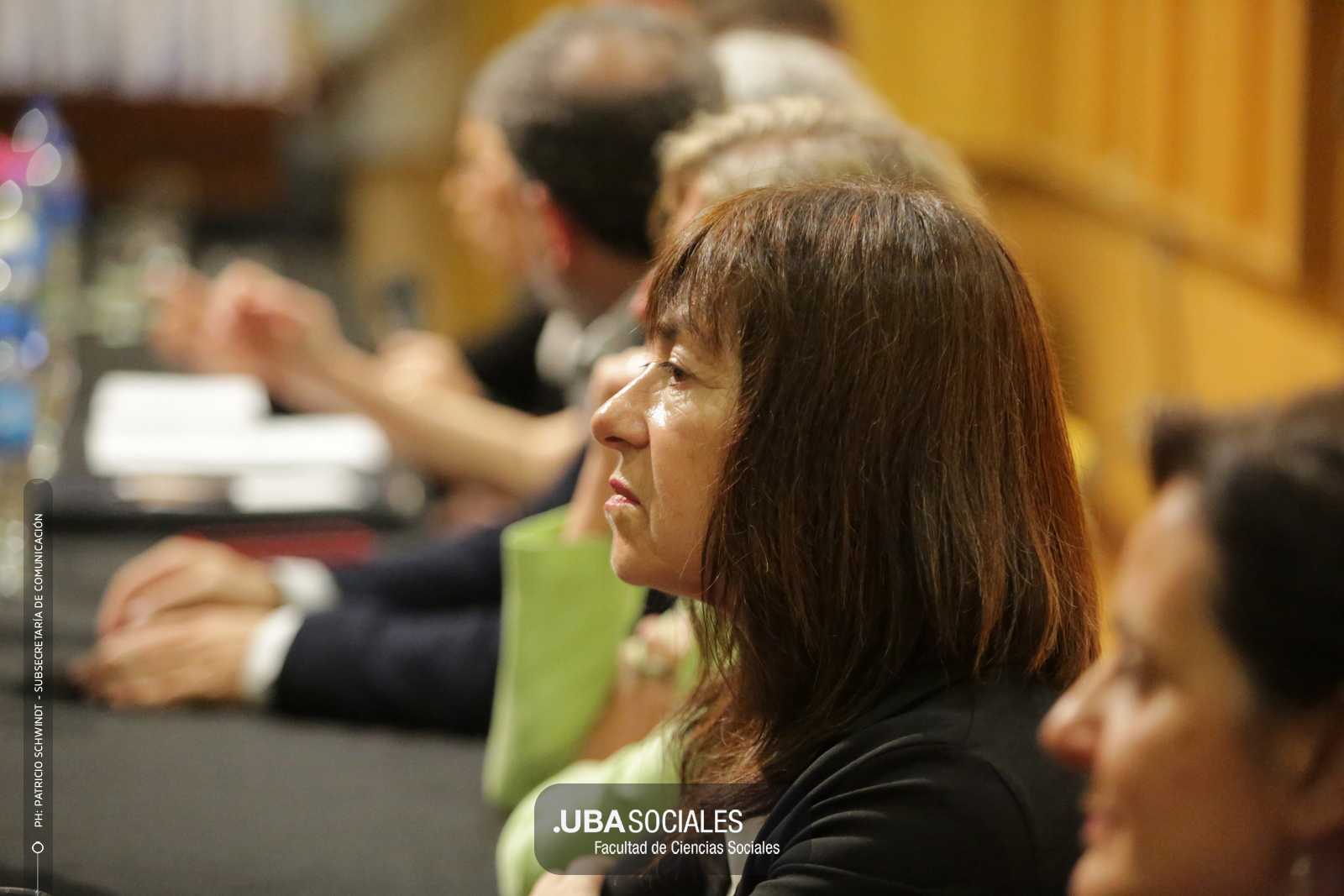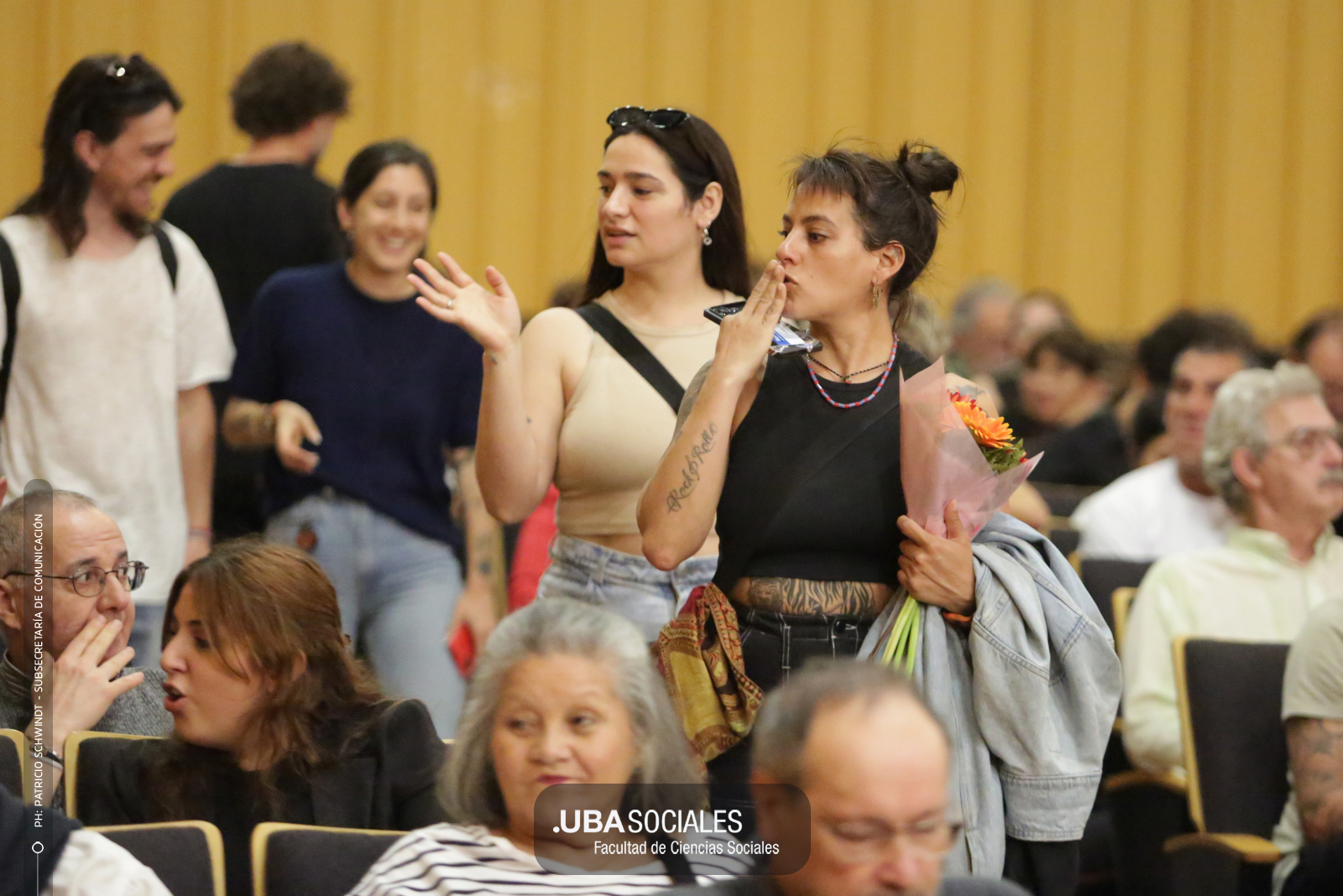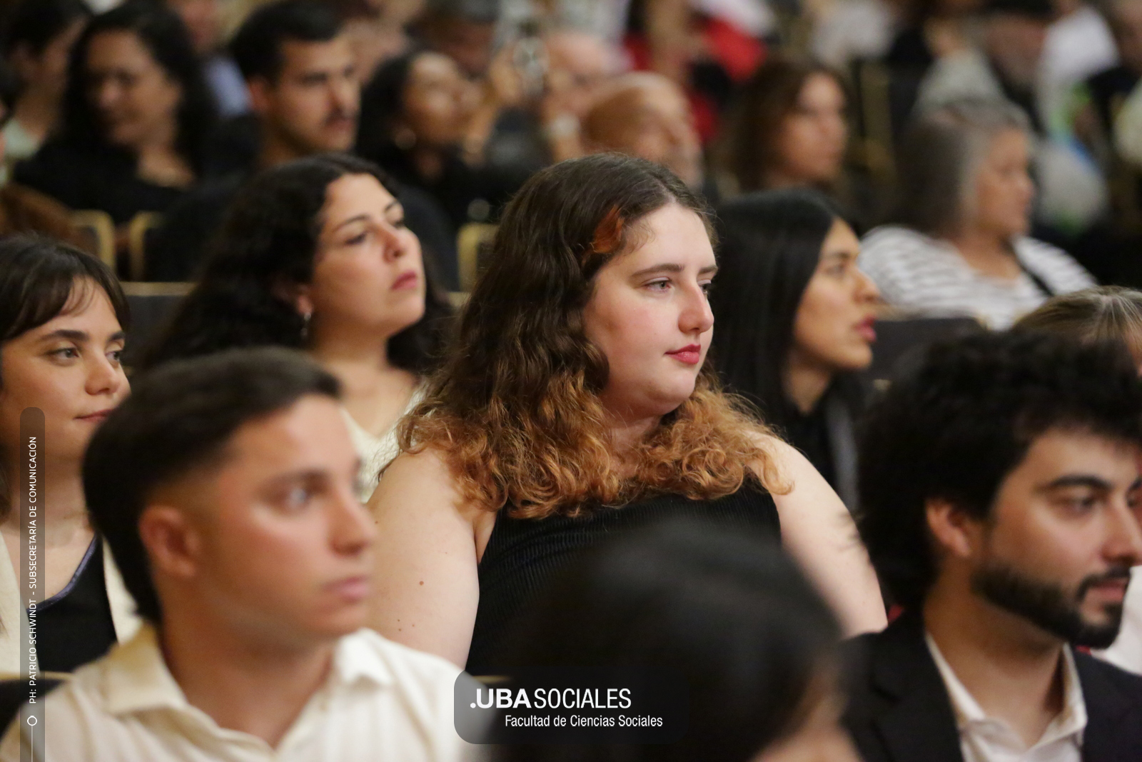 En el escenario la acompañaban el vicedecano Diego de Charras, el secretario académico, Hugo Lewin, la directora de la carrera de Ciencias de la Comunicación, Larisa Kejval, los secretarios académicos de Ciencia Política, Nicolás Zubiría; y de Relaciones del Trabajo, Matías Cao; y su par de Sociología, Sandra Guimenez, y la coordinadora técnica de Trabajo Social, Gisela Mastandrea.
