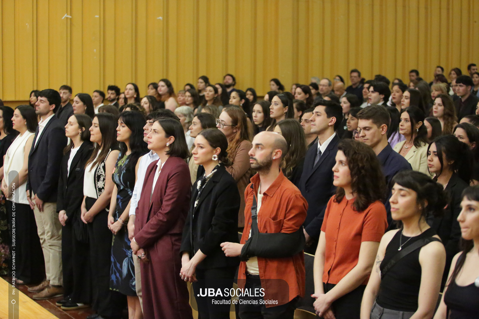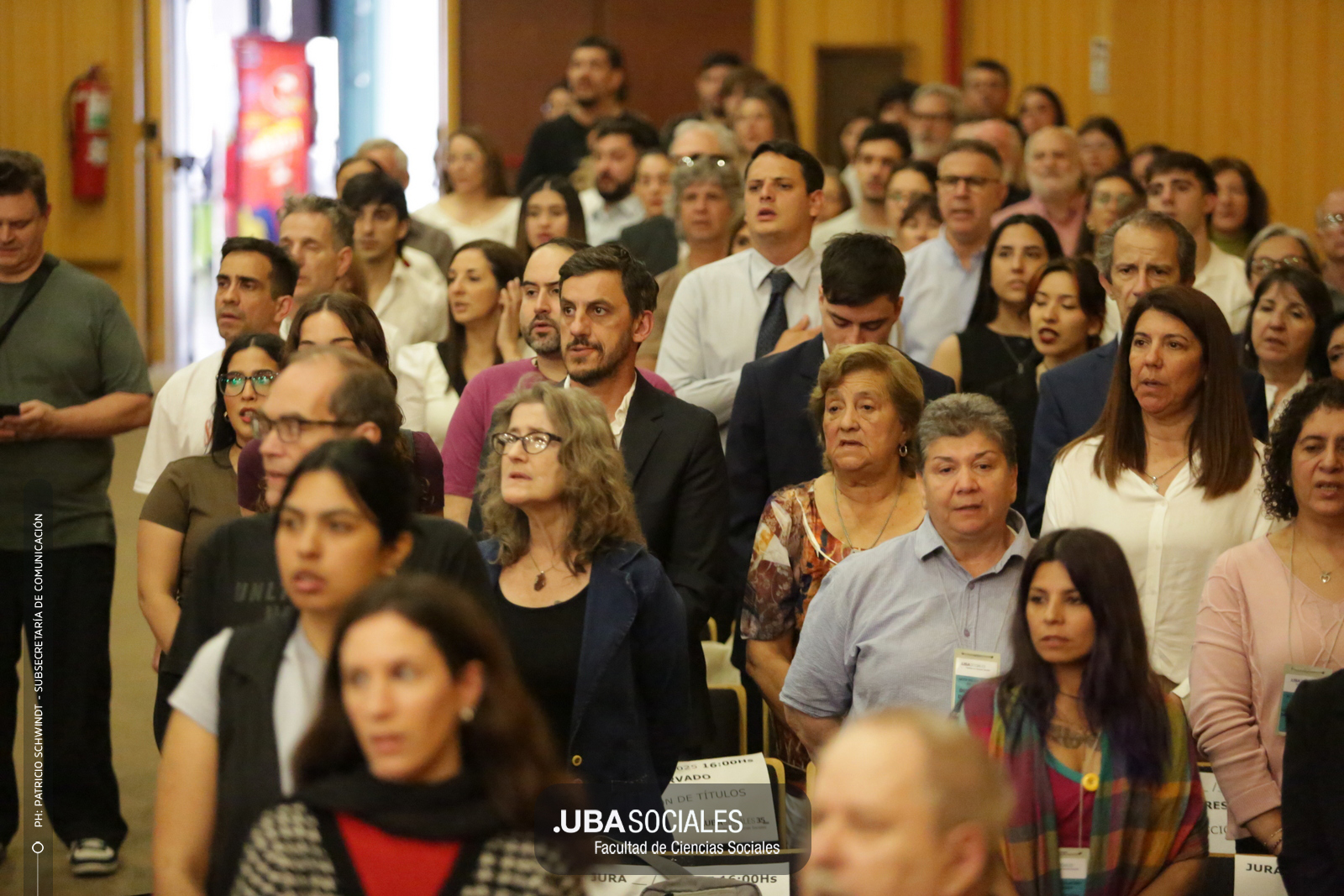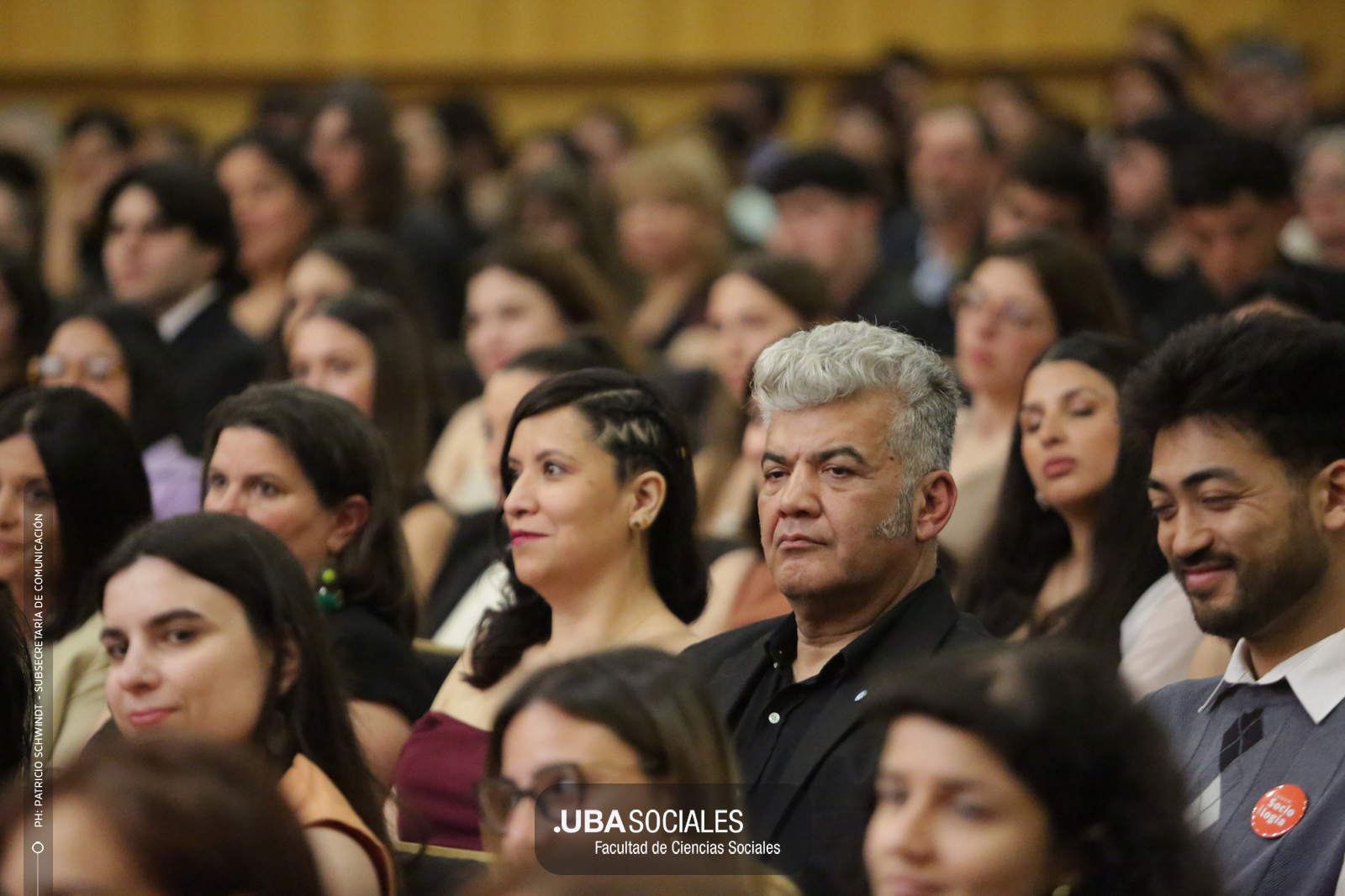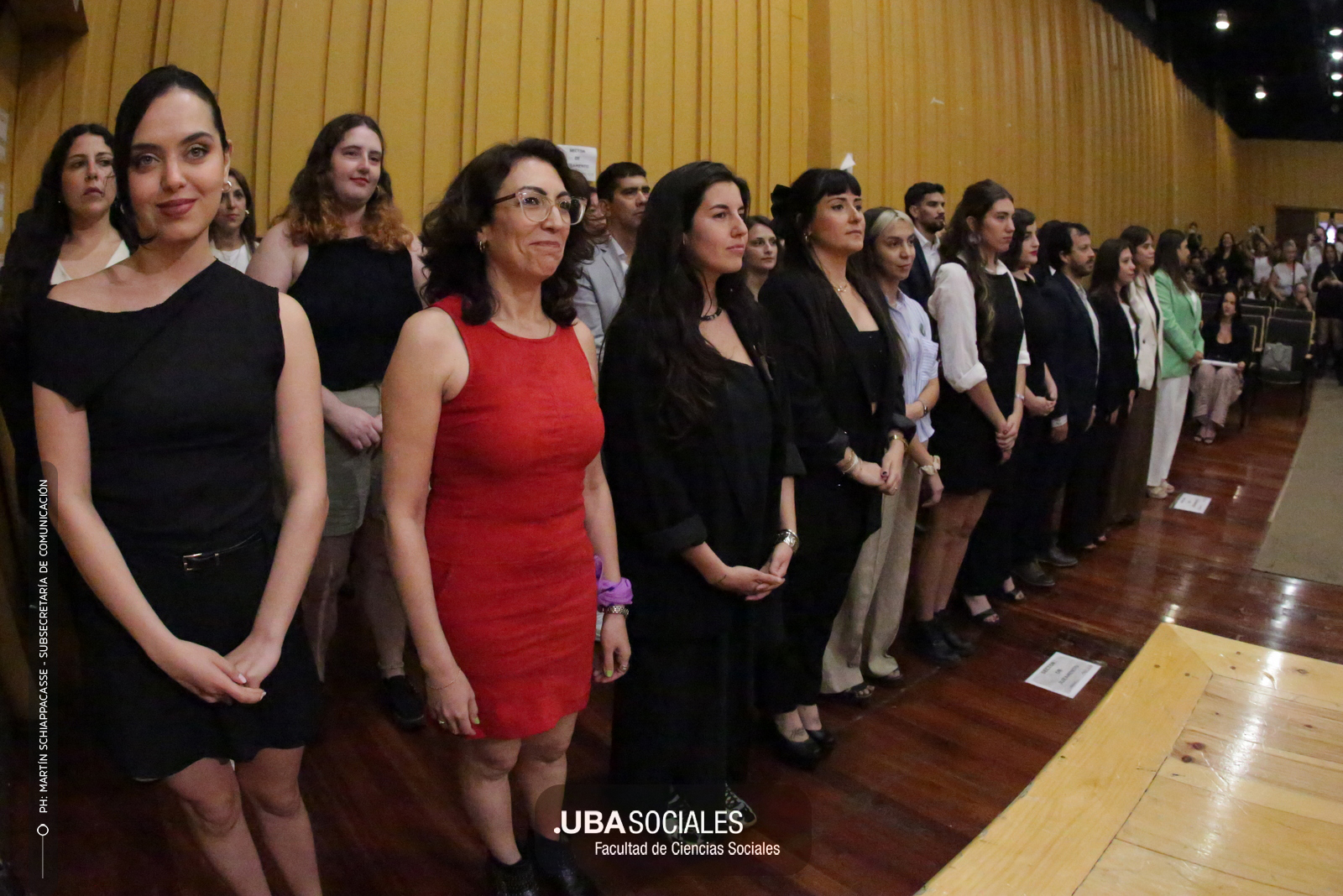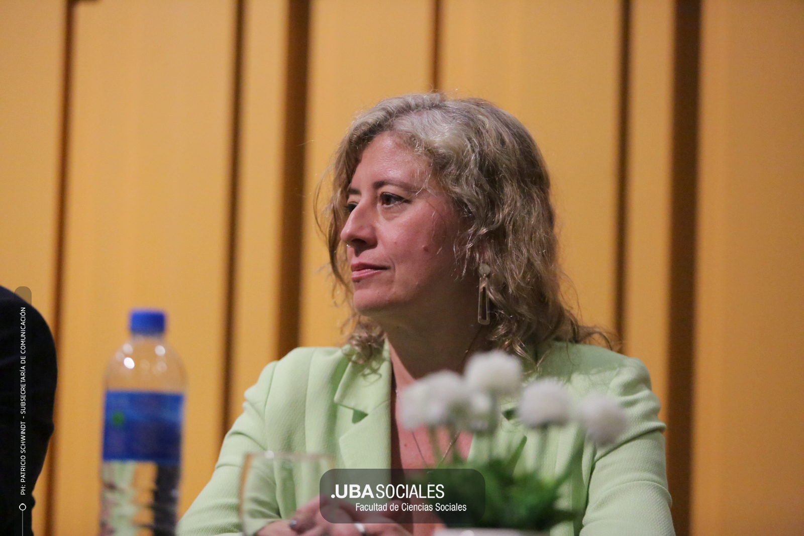 En el escenario la acompañaban el vicedecano Diego de Charras, el secretario académico, Hugo Lewin, la directora de la carrera de Ciencias de la Comunicación, Larisa Kejval, los secretarios académicos de Ciencia Política, Nicolás Zubiría; y de Relaciones del Trabajo, Matías Cao; y su par de Sociología, Sandra Guimenez, y la coordinadora técnica de Trabajo Social, Gisela Mastandrea.