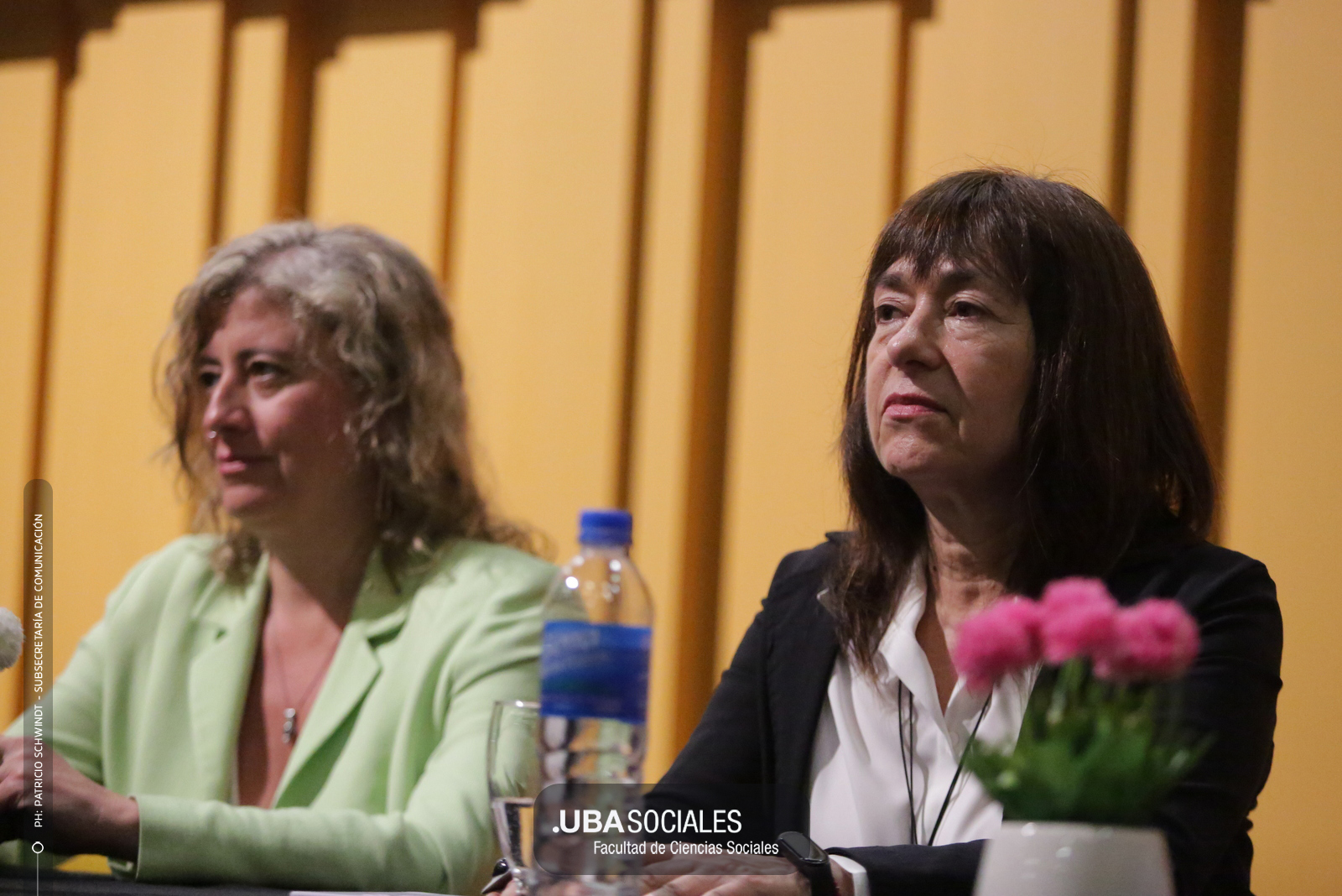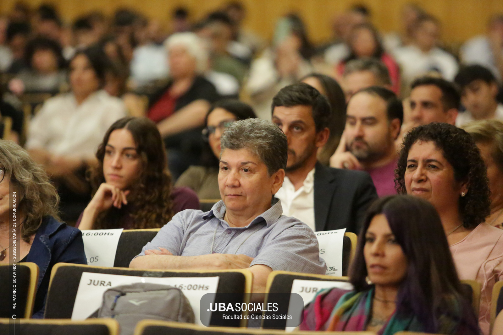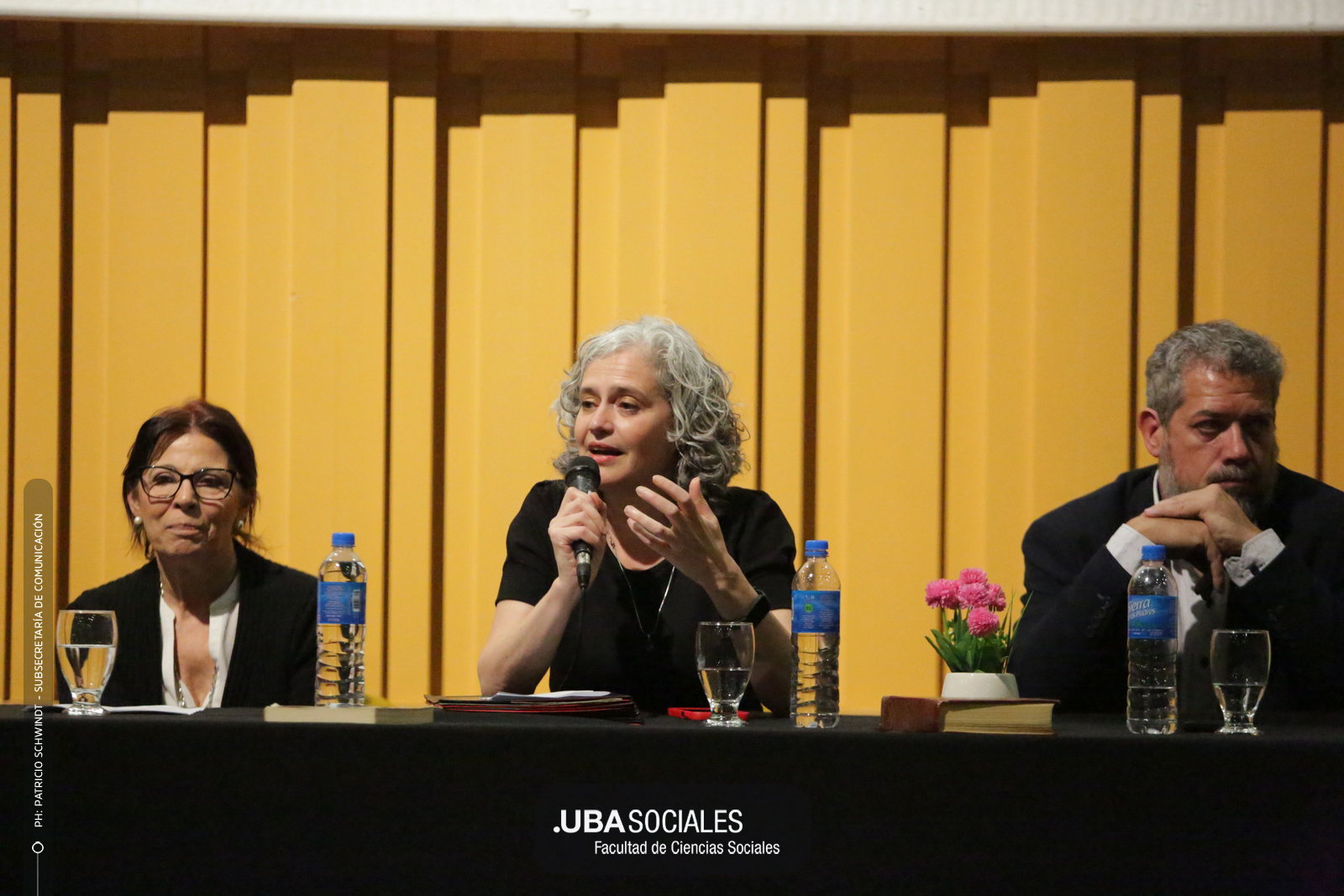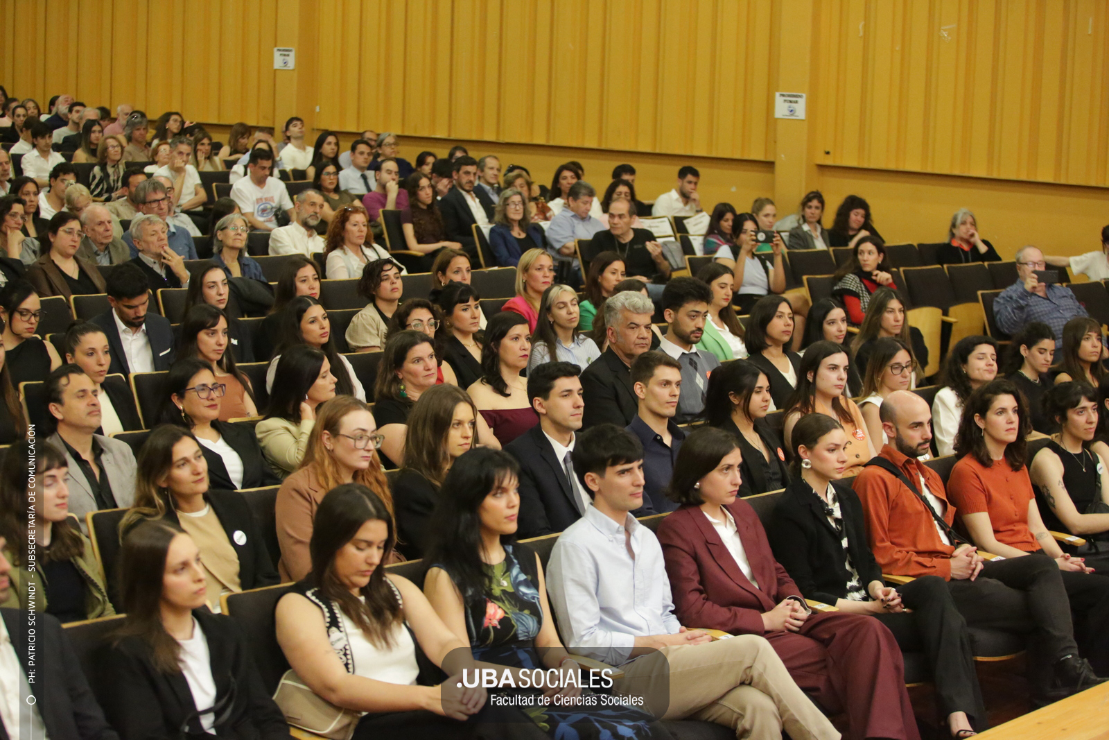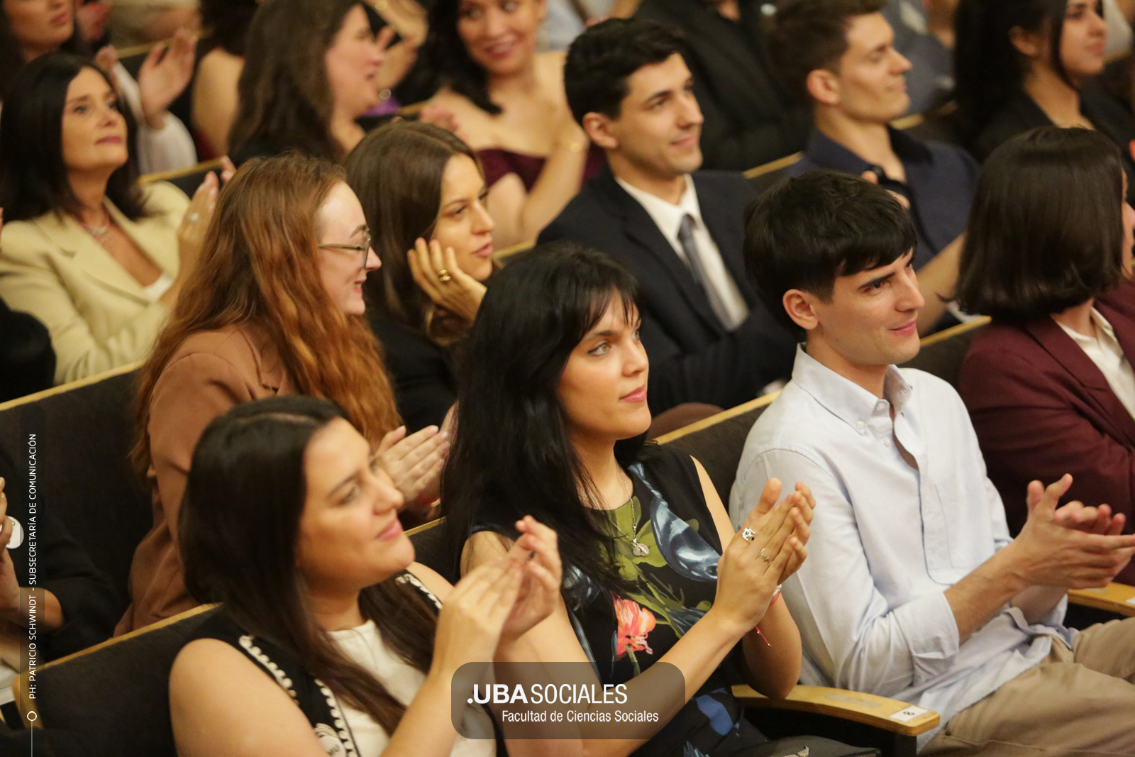 En el escenario la acompañaban el vicedecano Diego de Charras, el secretario académico, Hugo Lewin, la directora de la carrera de Ciencias de la Comunicación, Larisa Kejval, los secretarios académicos de Ciencia Política, Nicolás Zubiría; y de Relaciones del Trabajo, Matías Cao; y su par de Sociología, Sandra Guimenez, y la coordinadora técnica de Trabajo Social, Gisela Mastandrea.