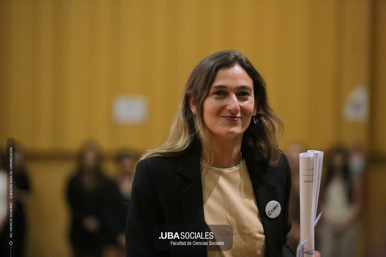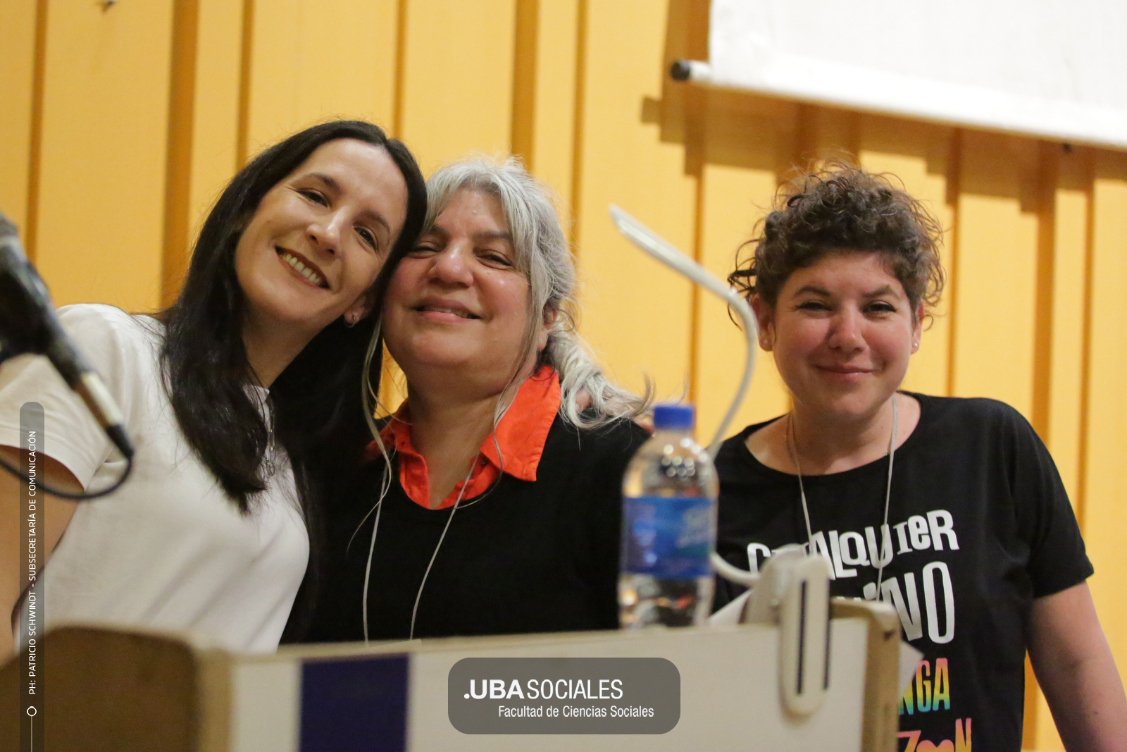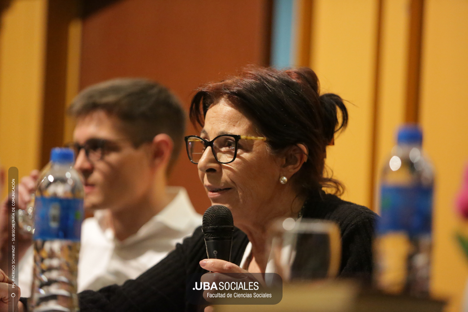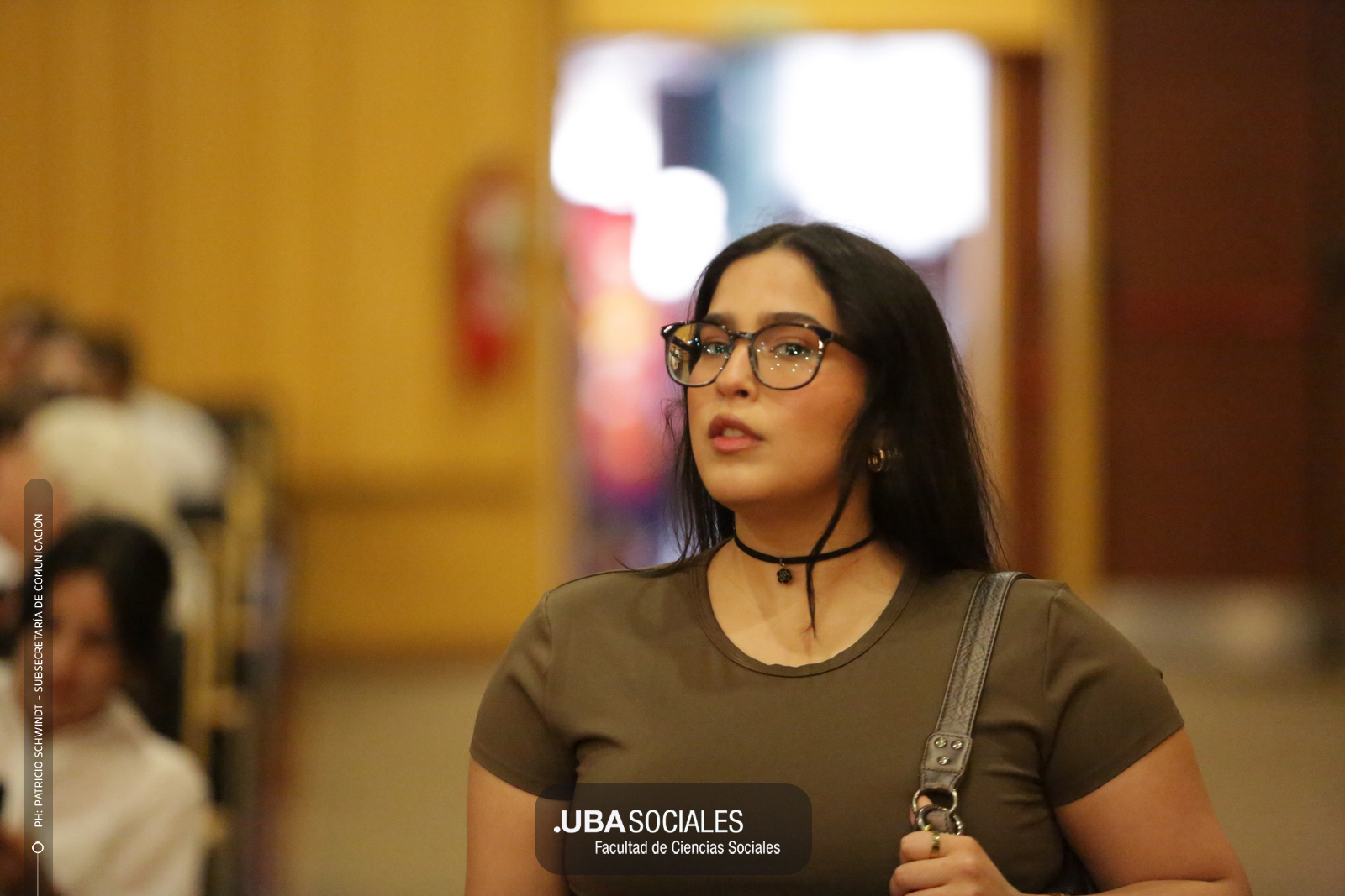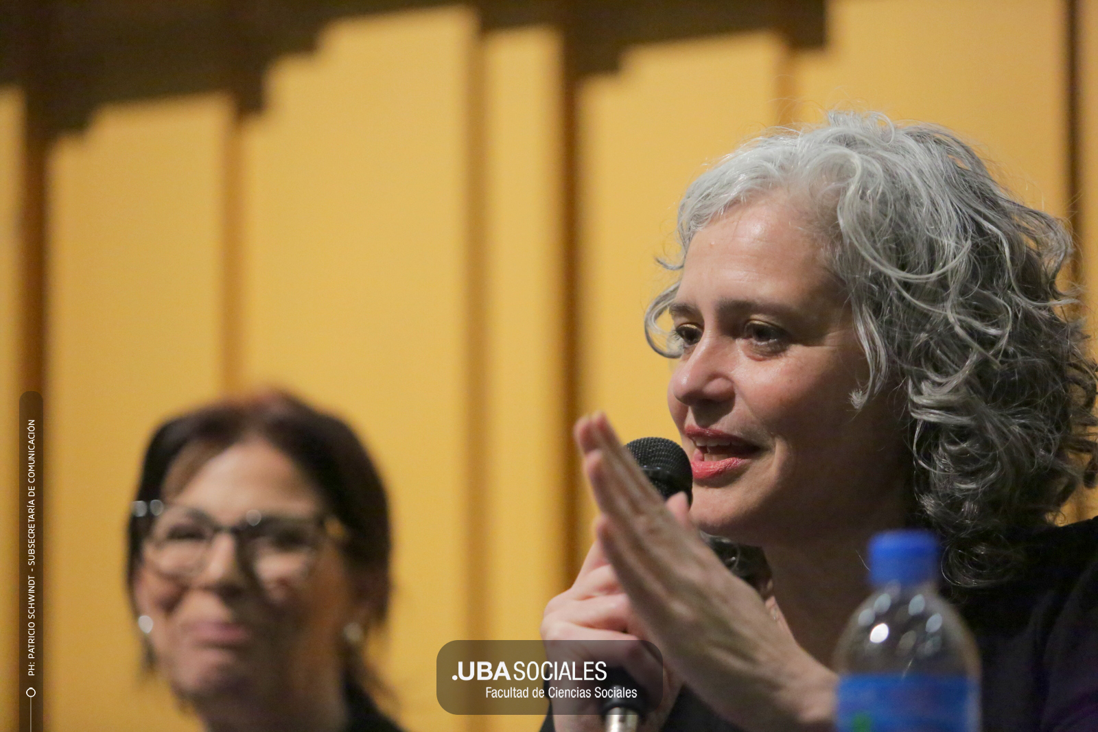 En el escenario la acompañaban el vicedecano Diego de Charras, el secretario académico, Hugo Lewin, la directora de la carrera de Ciencias de la Comunicación, Larisa Kejval, los secretarios académicos de Ciencia Política, Nicolás Zubiría; y de Relaciones del Trabajo, Matías Cao; y su par de Sociología, Sandra Guimenez, y la coordinadora técnica de Trabajo Social, Gisela Mastandrea.