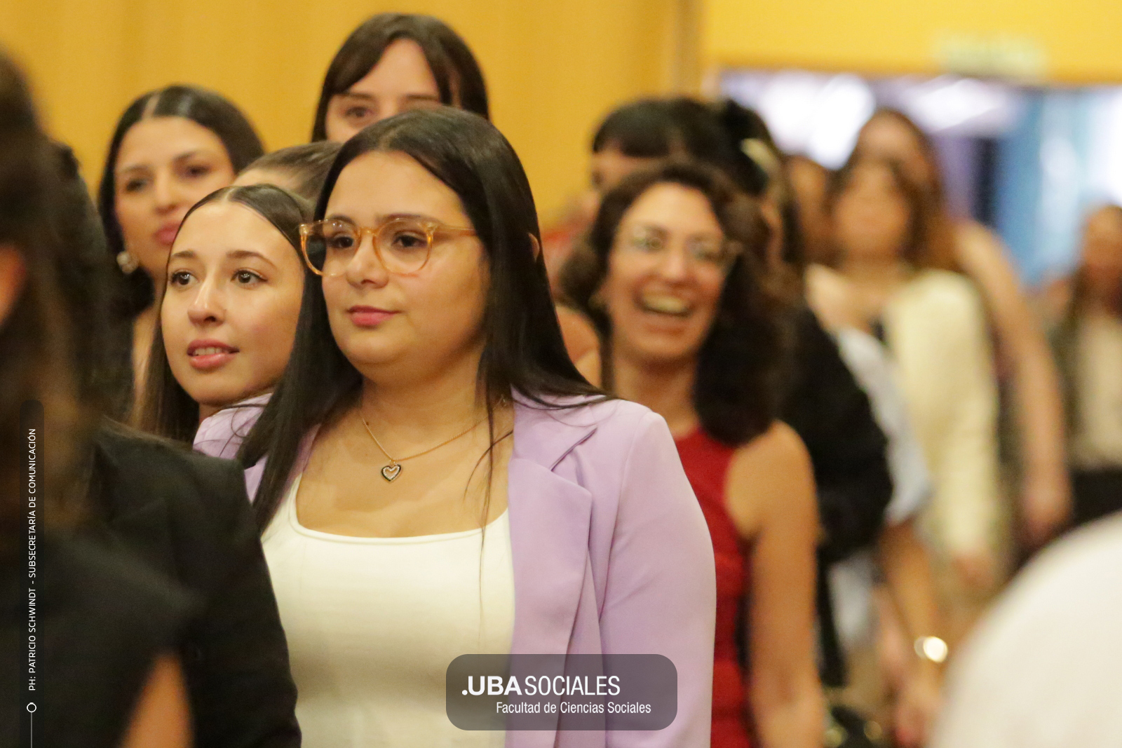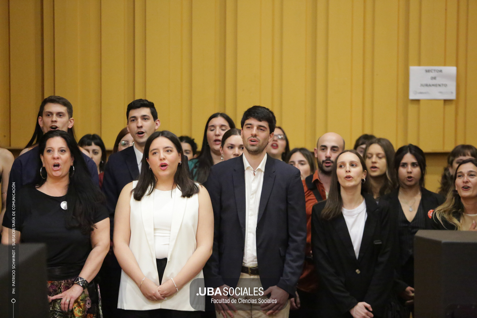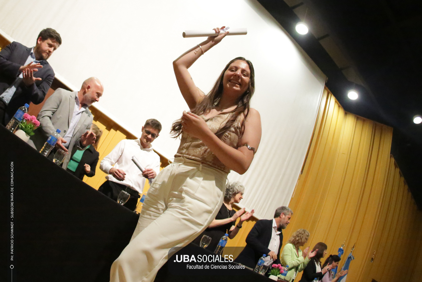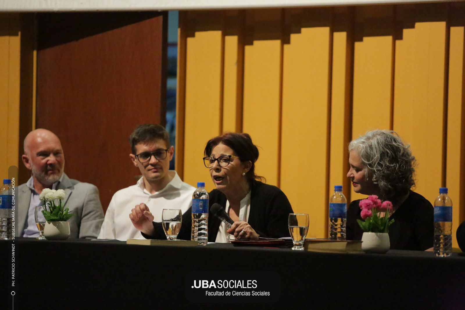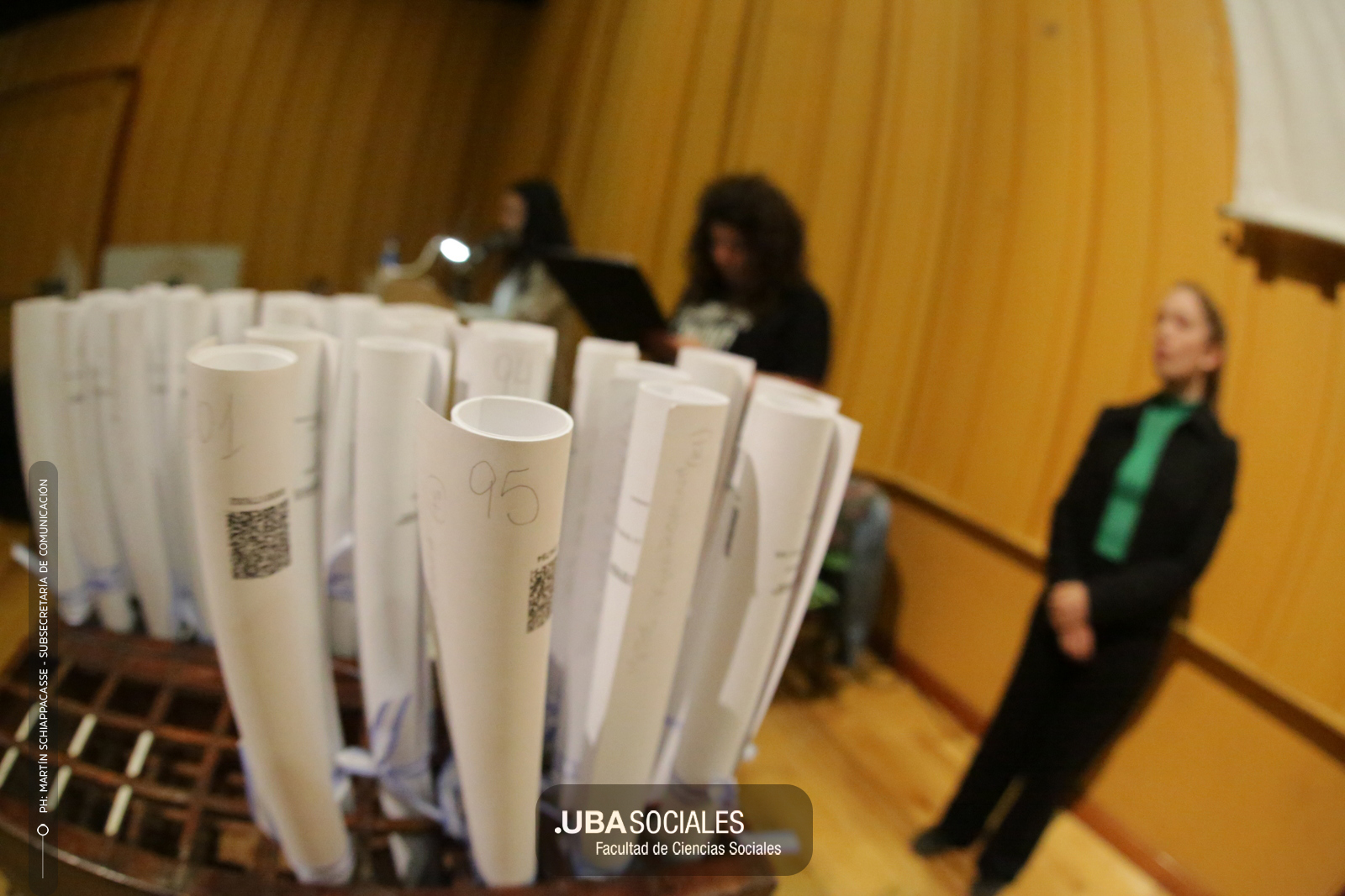 En el escenario la acompañaban el vicedecano Diego de Charras, el secretario académico, Hugo Lewin, la directora de la carrera de Ciencias de la Comunicación, Larisa Kejval, los secretarios académicos de Ciencia Política, Nicolás Zubiría; y de Relaciones del Trabajo, Matías Cao; y su par de Sociología, Sandra Guimenez, y la coordinadora técnica de Trabajo Social, Gisela Mastandrea.