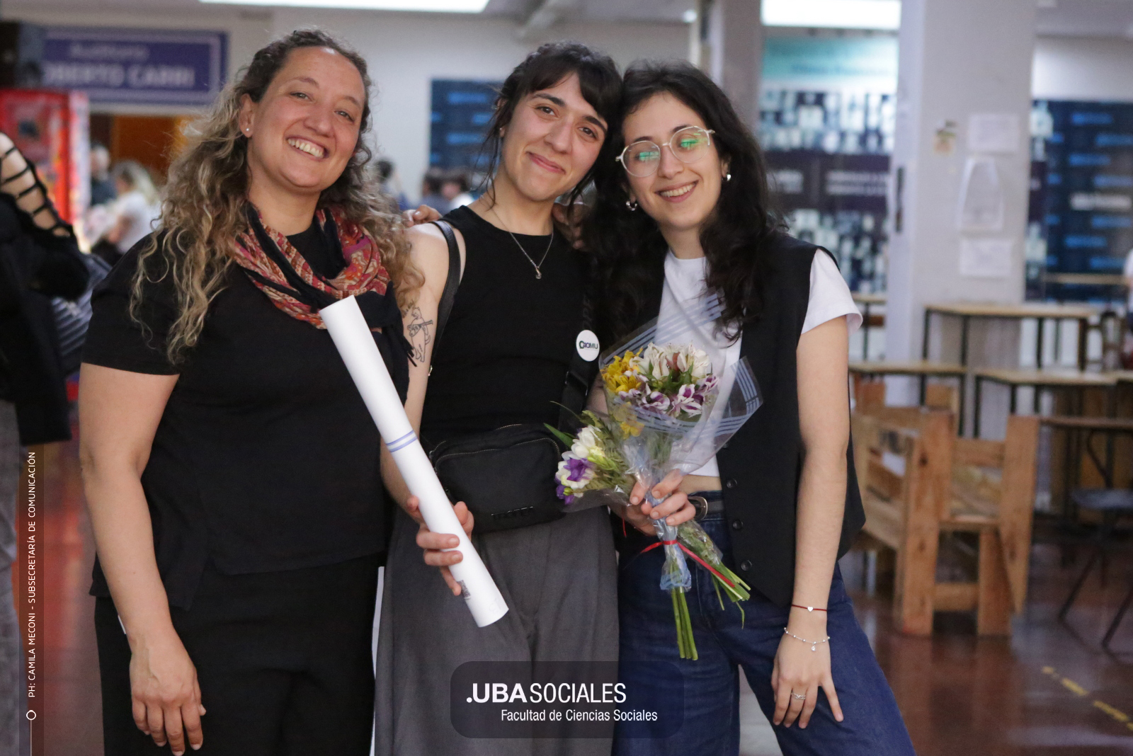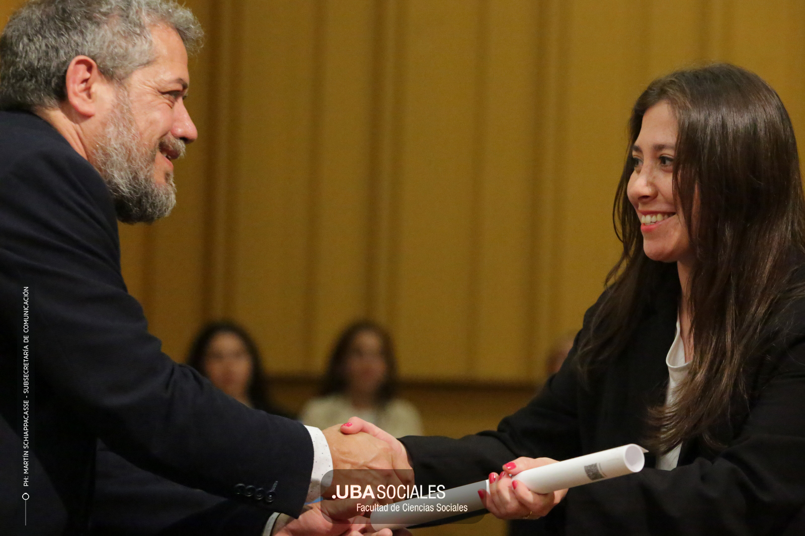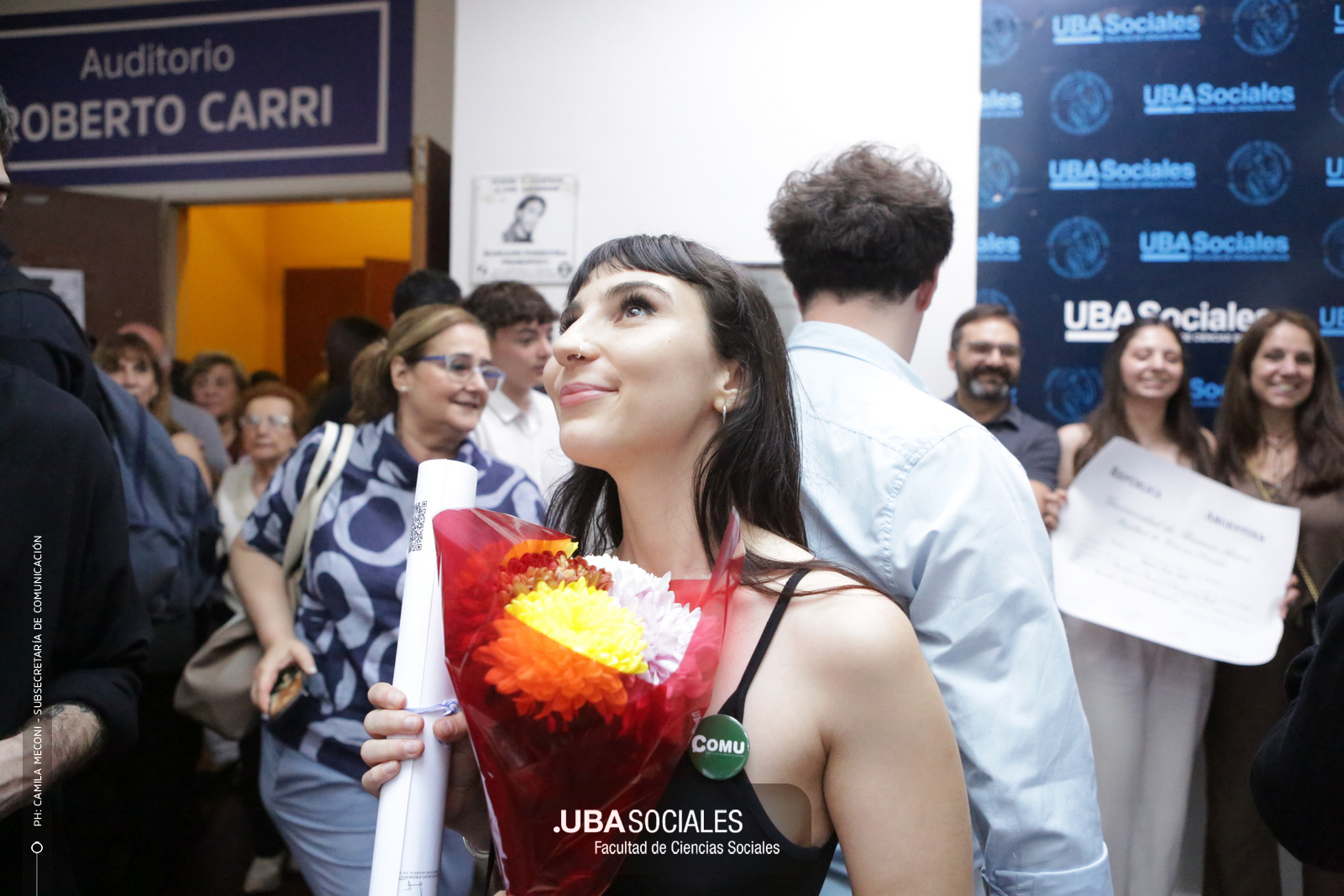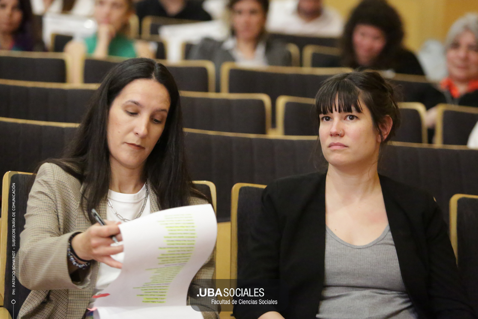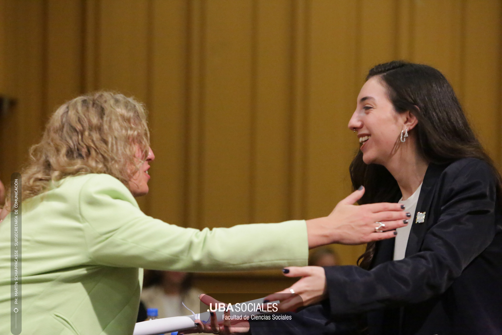 En el escenario la acompañaban el vicedecano Diego de Charras, el secretario académico, Hugo Lewin, la directora de la carrera de Ciencias de la Comunicación, Larisa Kejval, los secretarios académicos de Ciencia Política, Nicolás Zubiría; y de Relaciones del Trabajo, Matías Cao; y su par de Sociología, Sandra Guimenez, y la coordinadora técnica de Trabajo Social, Gisela Mastandrea.