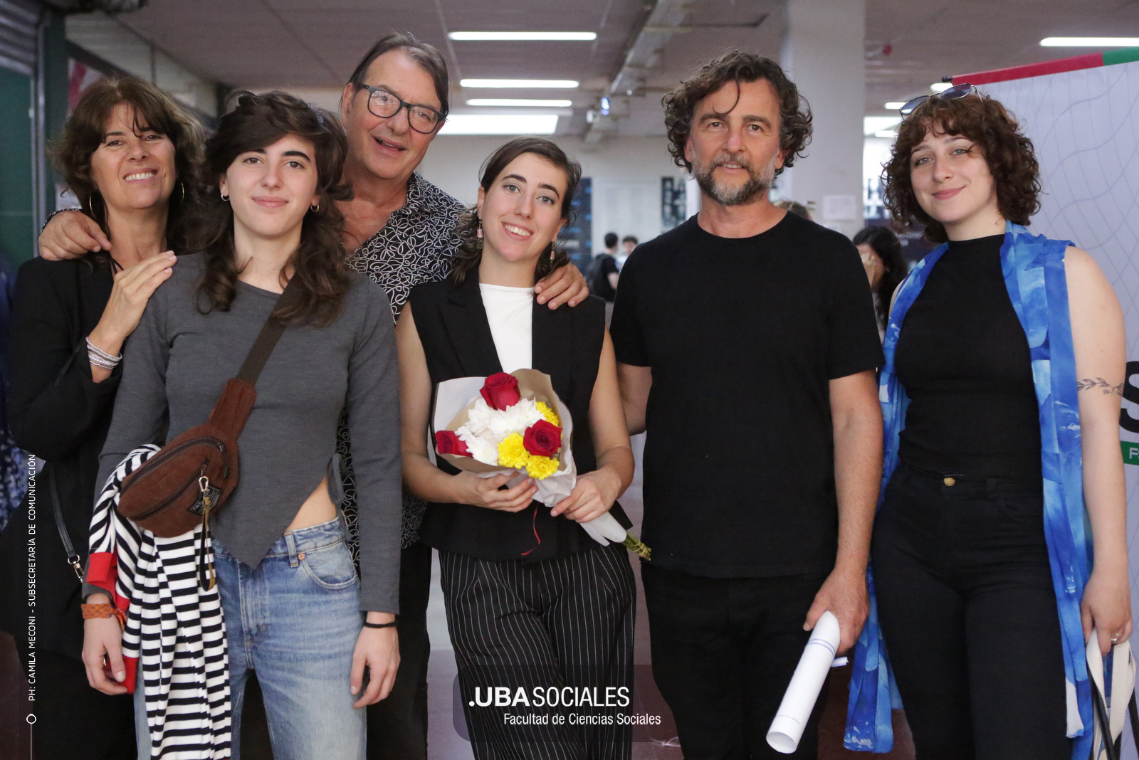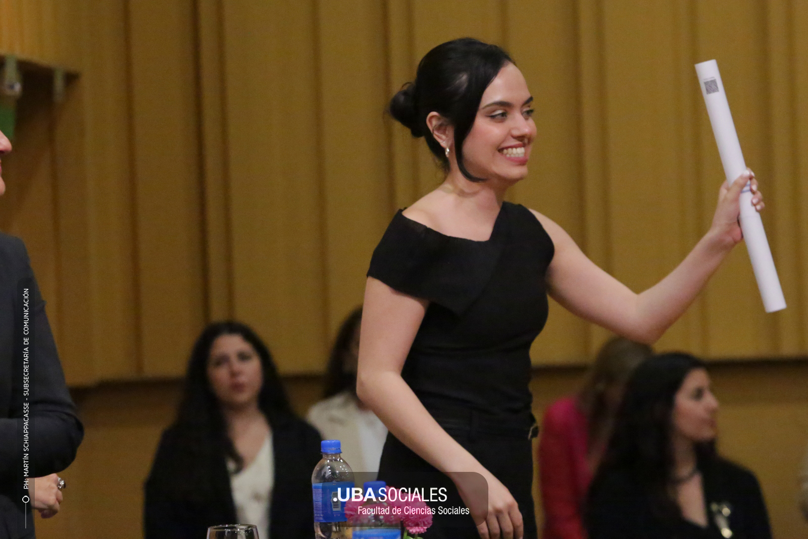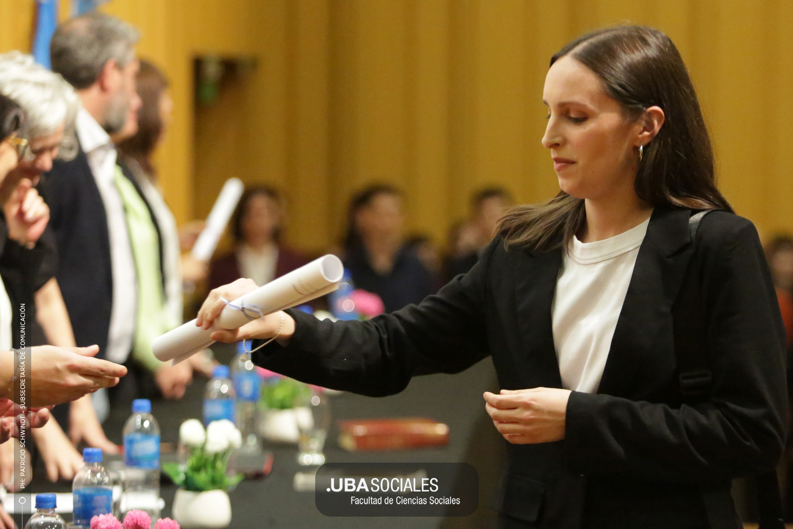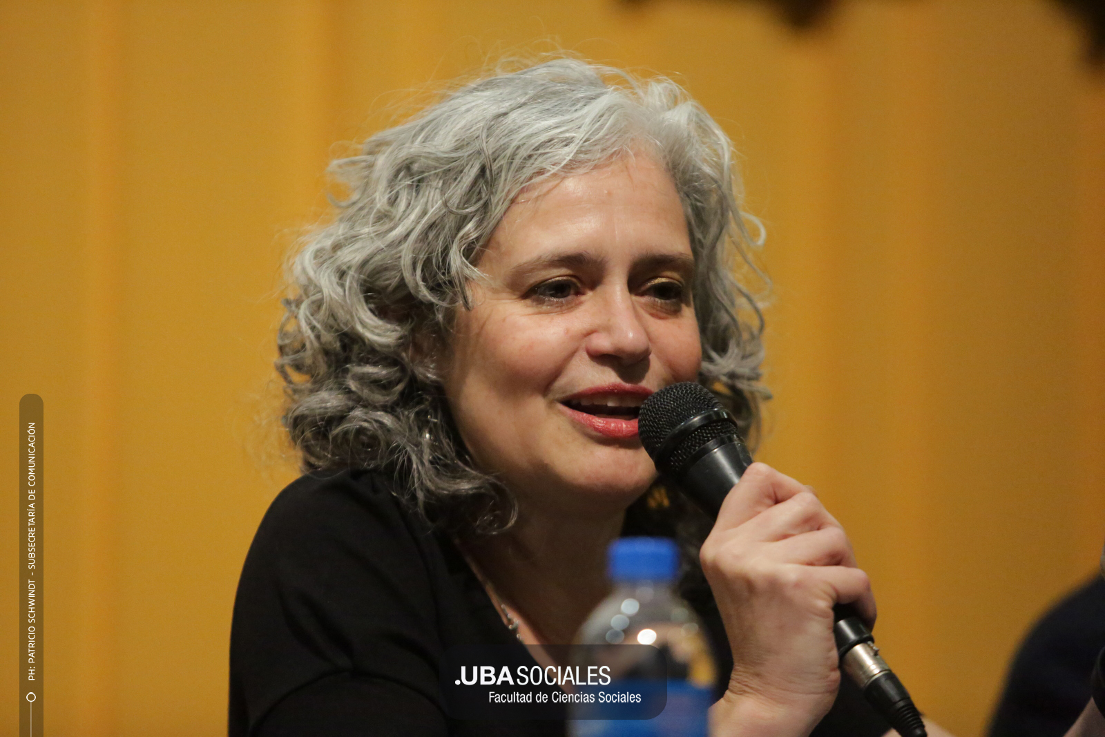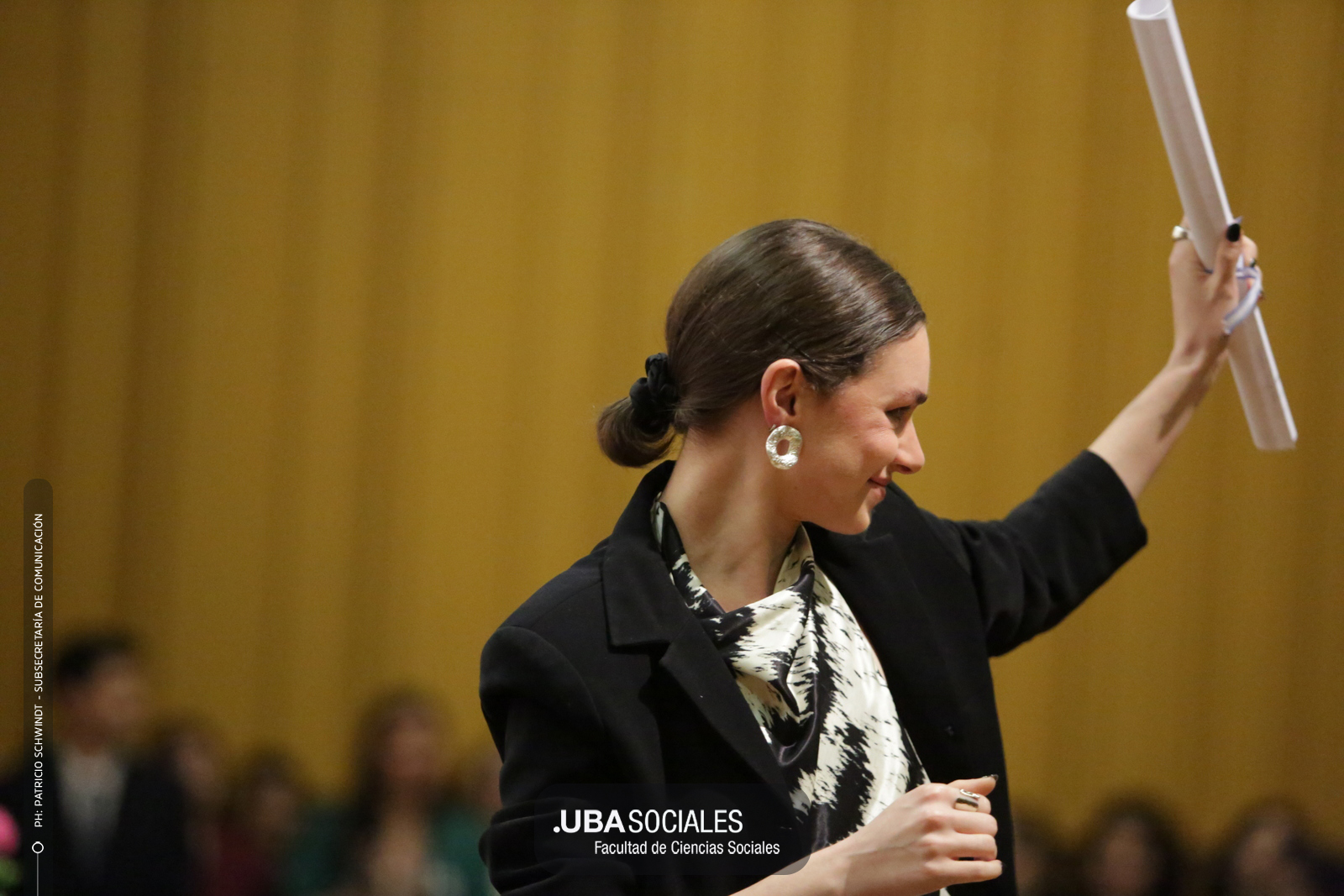En el escenario la acompañaban el vicedecano Diego de Charras, el secretario académico, Hugo Lewin, la directora de la carrera de Ciencias de la Comunicación, Larisa Kejval, los secretarios académicos de Ciencia Política, Nicolás Zubiría; y de Relaciones del Trabajo, Matías Cao; y su par de Sociología, Sandra Guimenez, y la coordinadora técnica de Trabajo Social, Gisela Mastandrea.