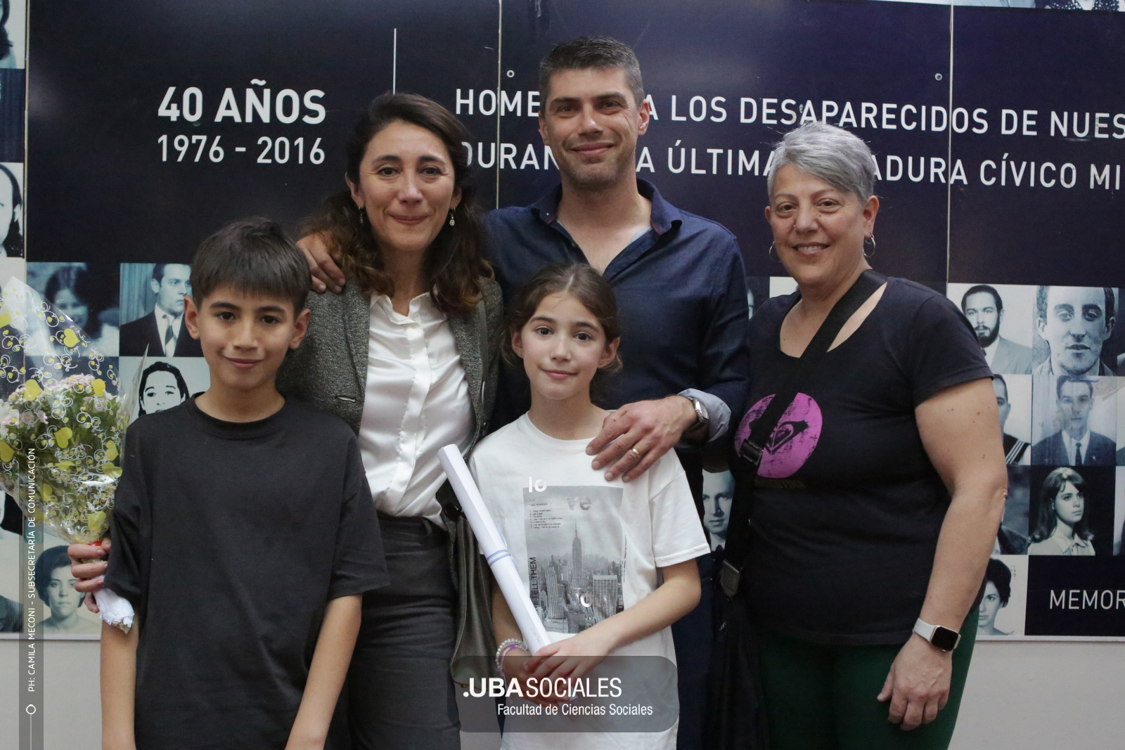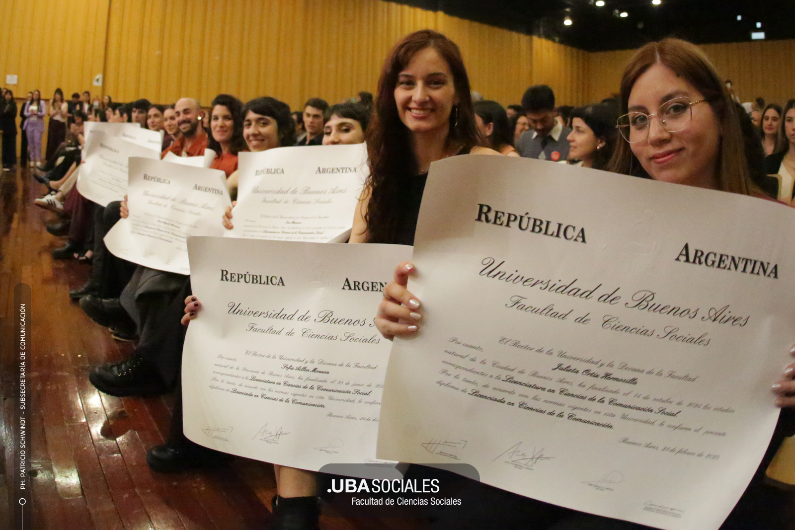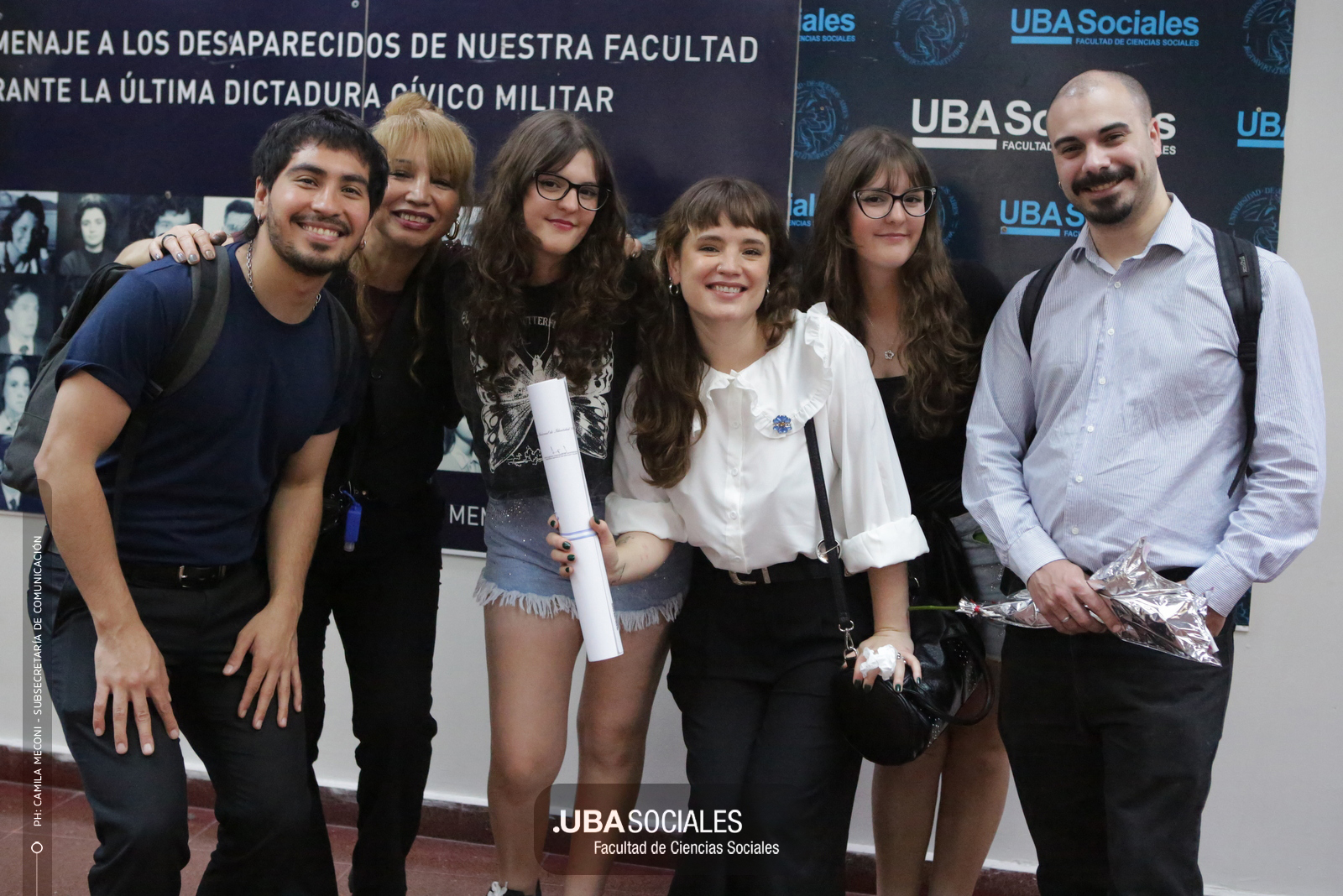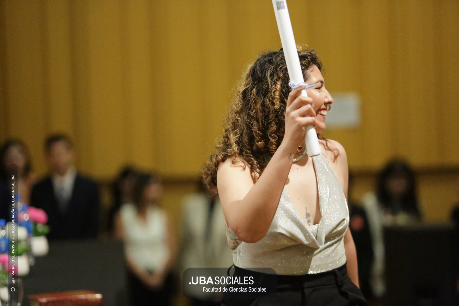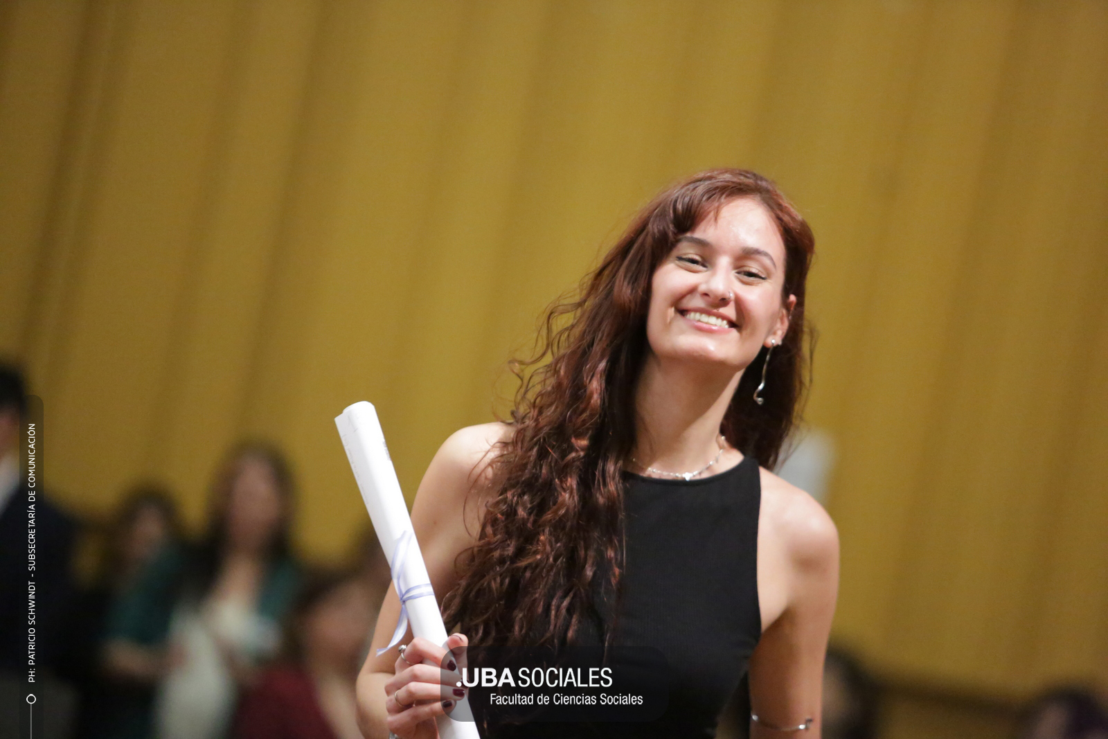 En el escenario la acompañaban el vicedecano Diego de Charras, el secretario académico, Hugo Lewin, la directora de la carrera de Ciencias de la Comunicación, Larisa Kejval, los secretarios académicos de Ciencia Política, Nicolás Zubiría; y de Relaciones del Trabajo, Matías Cao; y su par de Sociología, Sandra Guimenez, y la coordinadora técnica de Trabajo Social, Gisela Mastandrea.