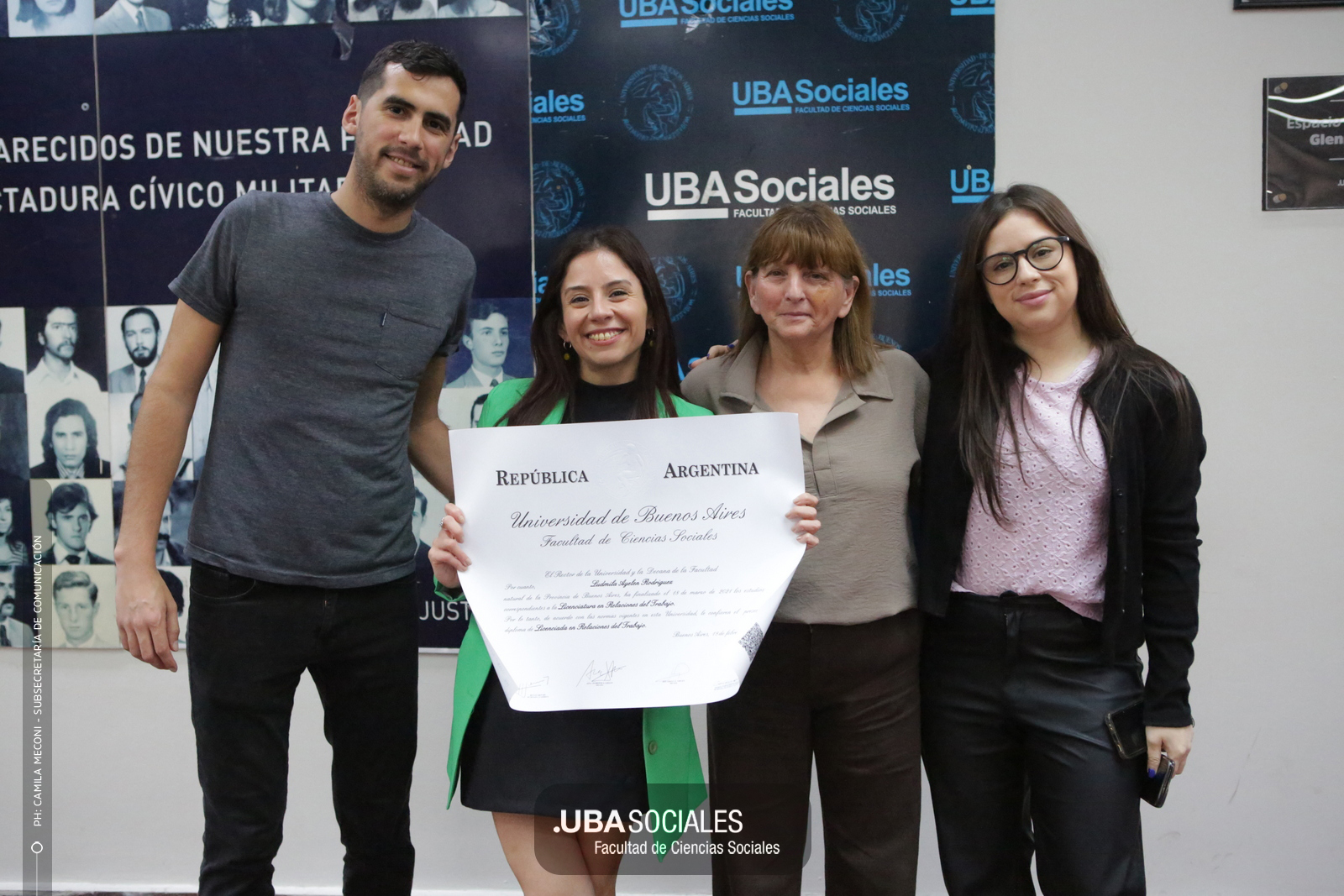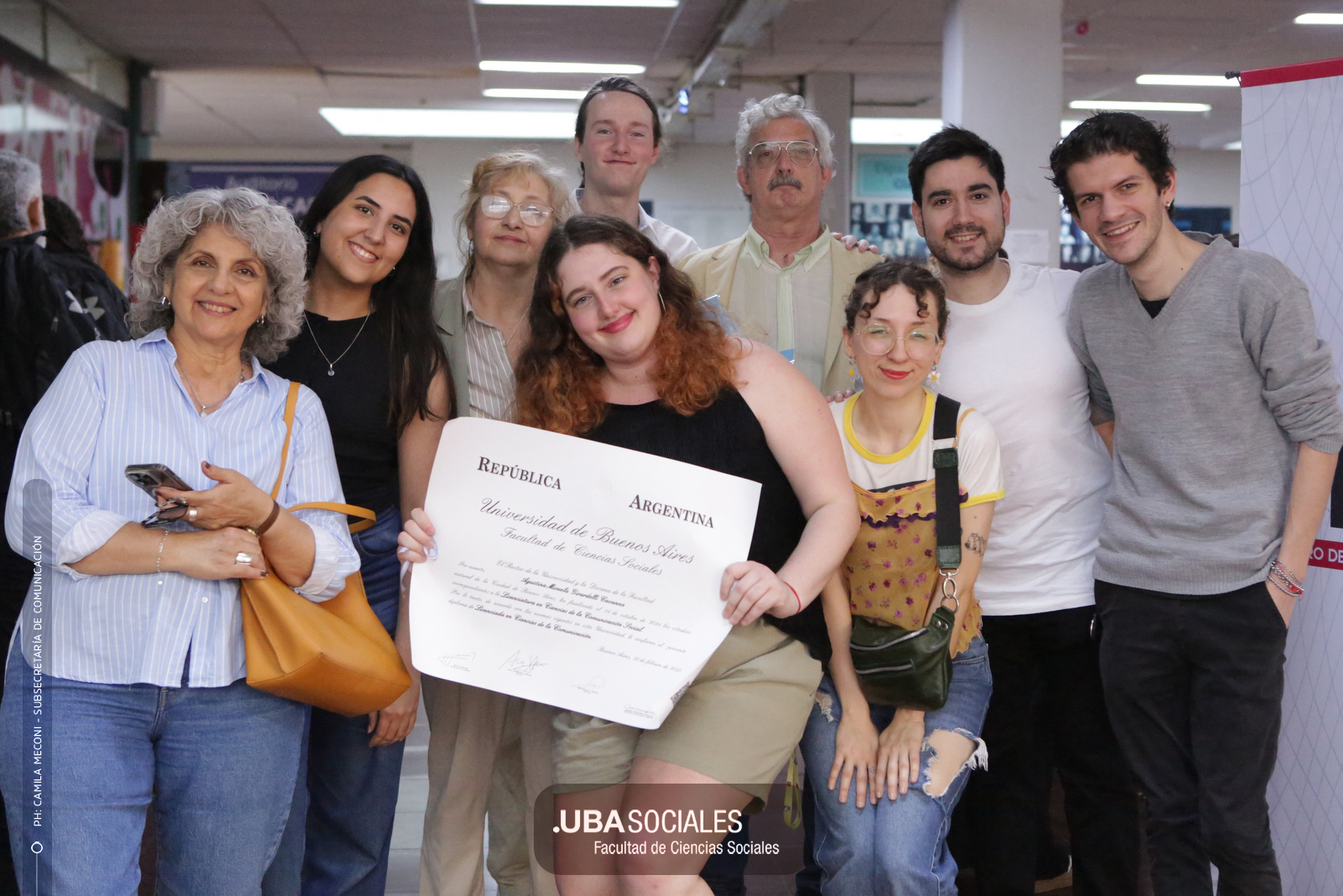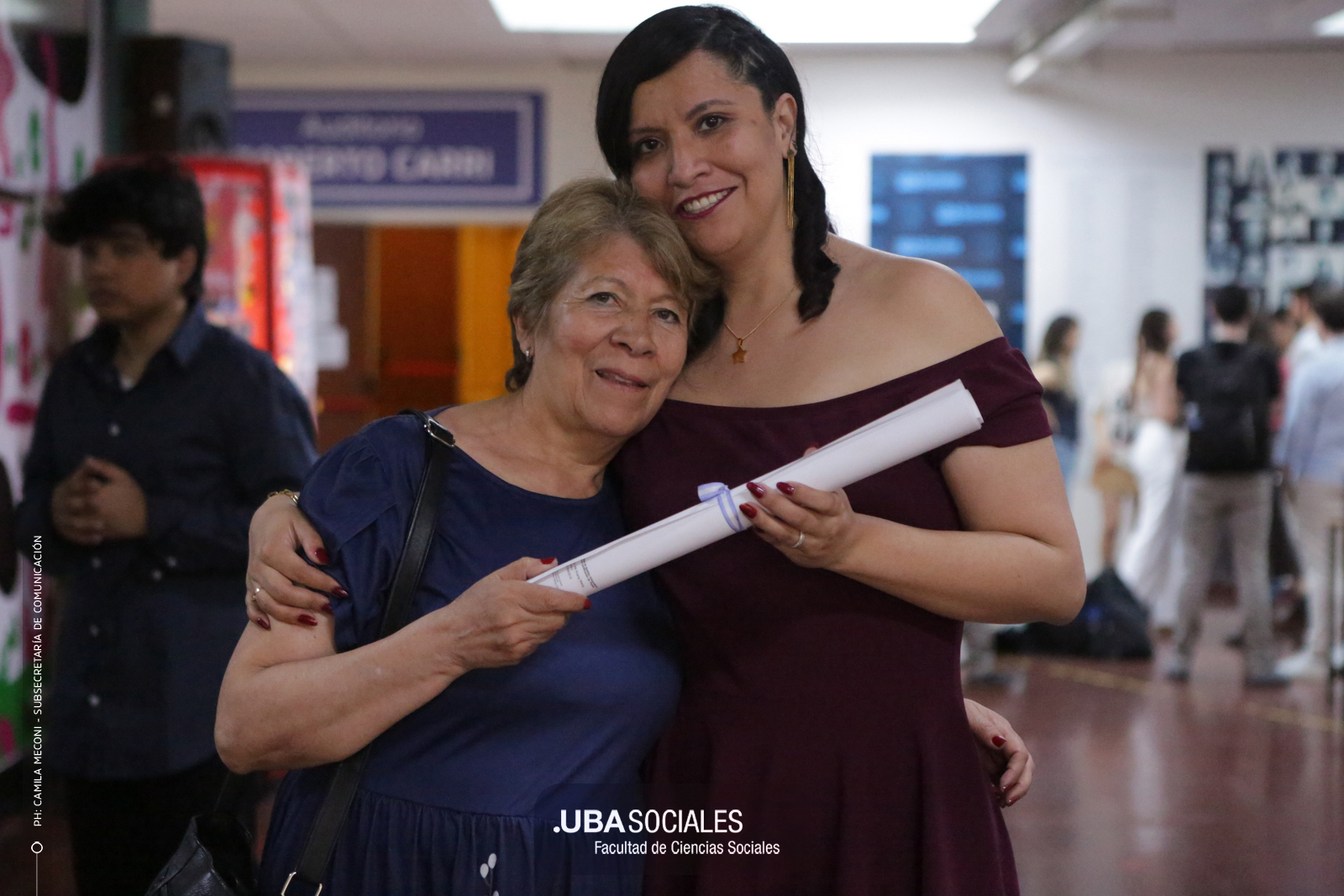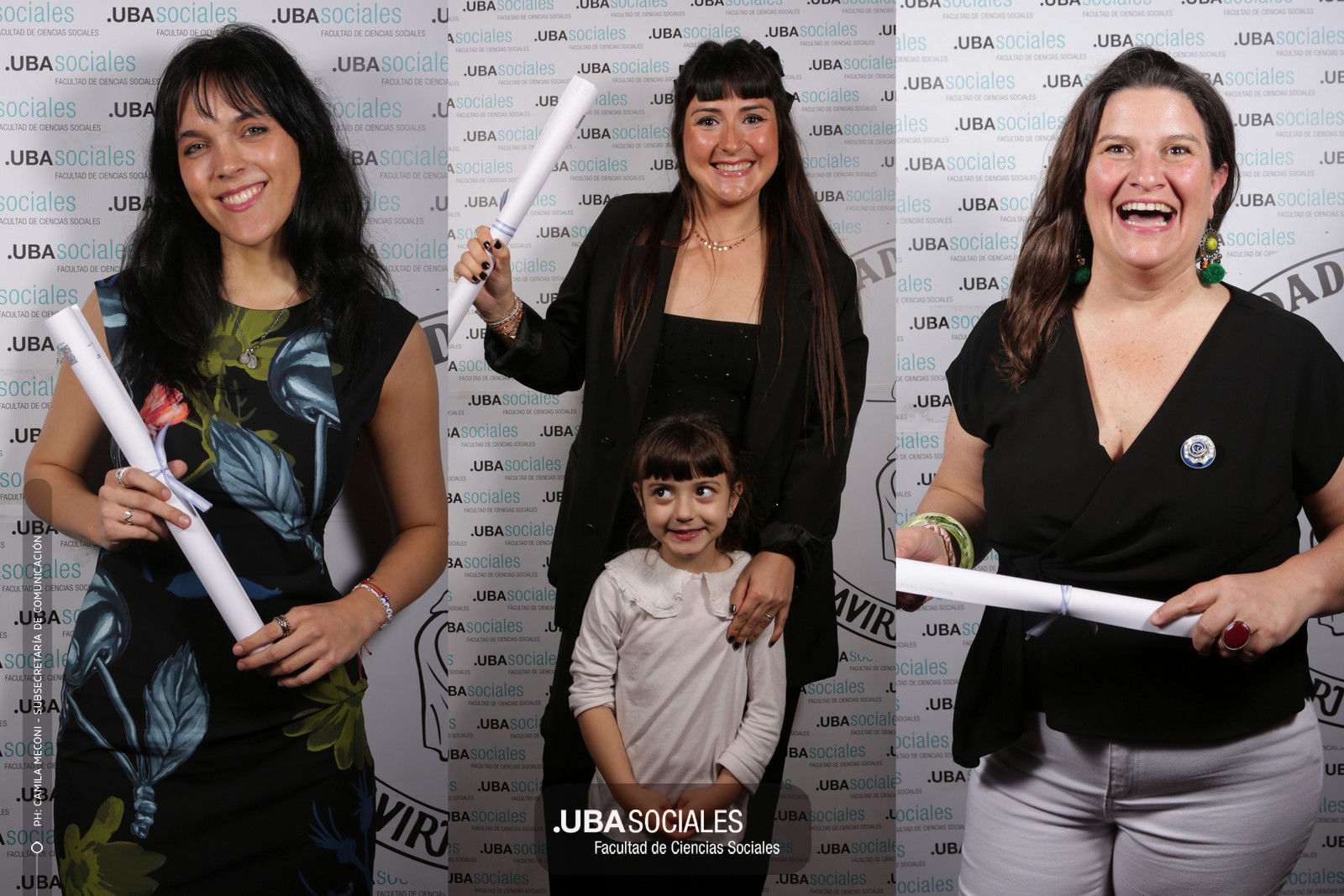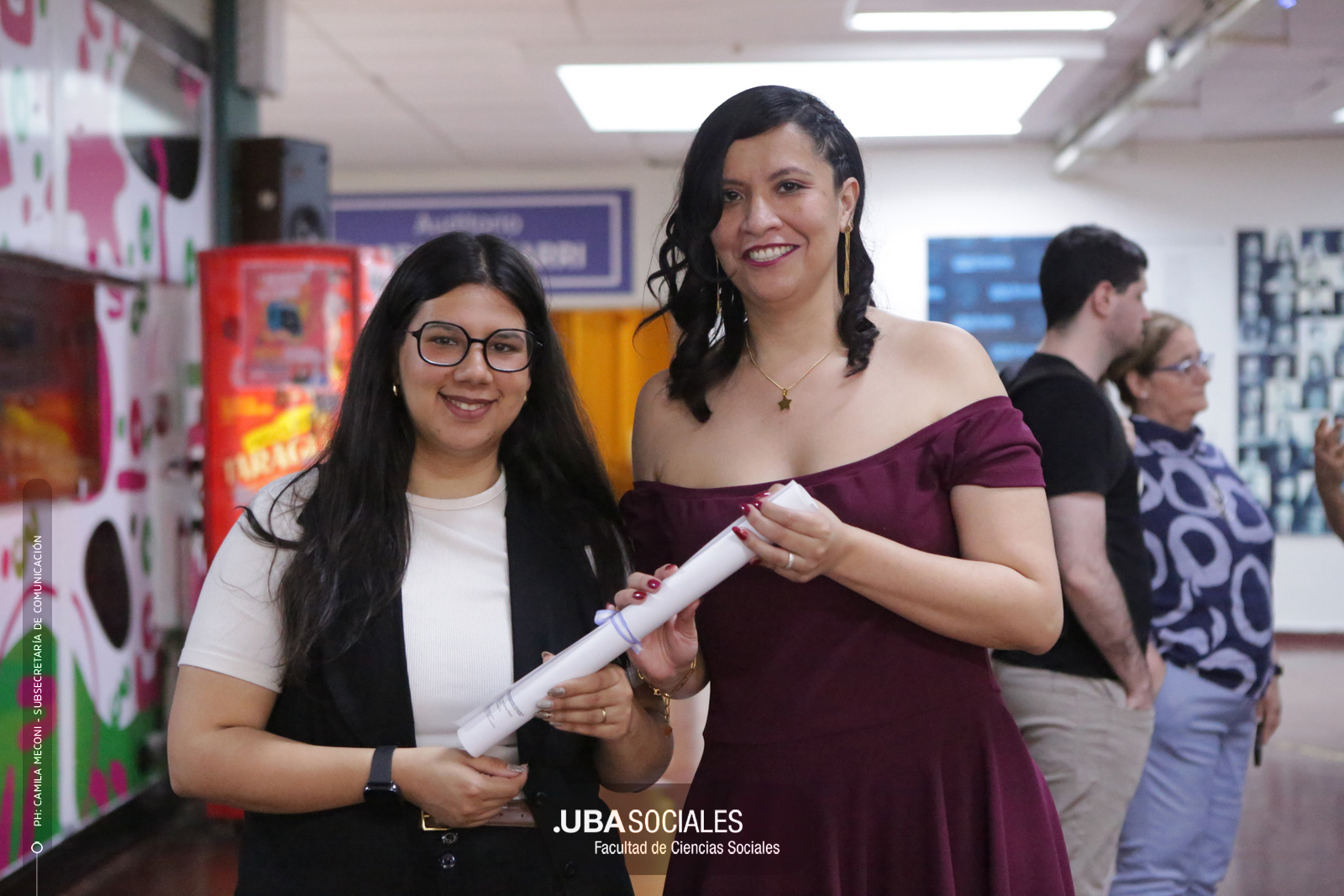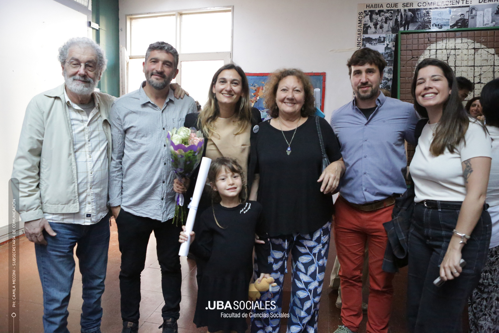 En el escenario la acompañaban el vicedecano Diego de Charras, el secretario académico, Hugo Lewin, la directora de la carrera de Ciencias de la Comunicación, Larisa Kejval, los secretarios académicos de Ciencia Política, Nicolás Zubiría; y de Relaciones del Trabajo, Matías Cao; y su par de Sociología, Sandra Guimenez, y la coordinadora técnica de Trabajo Social, Gisela Mastandrea.