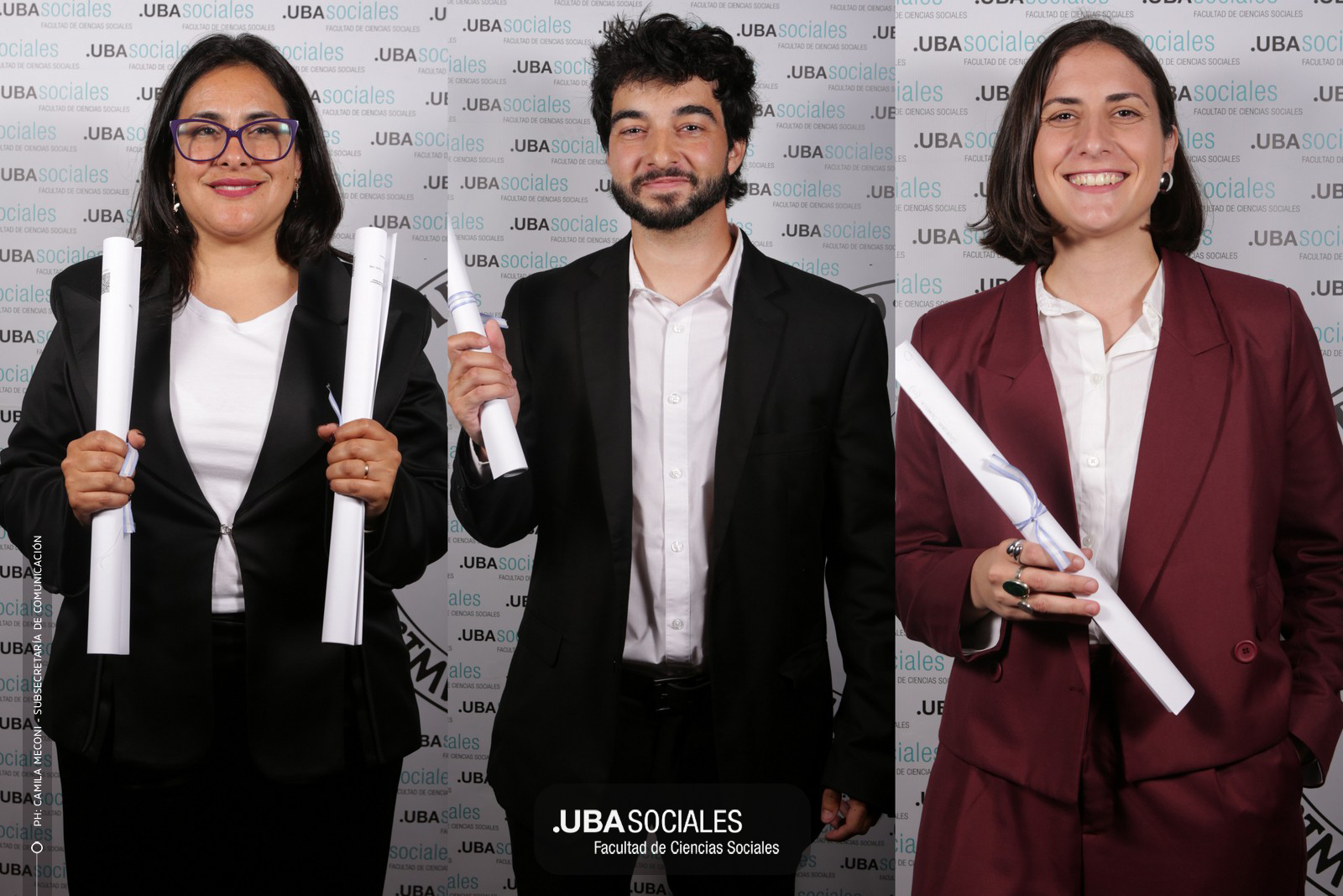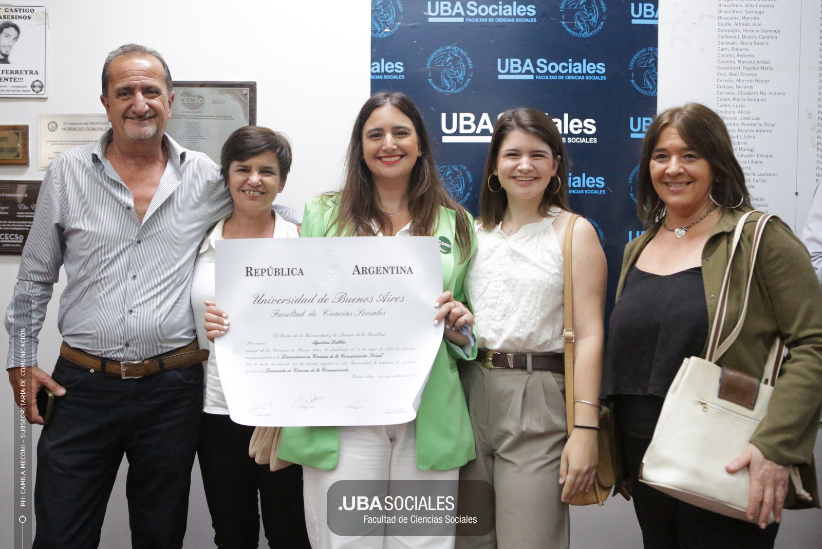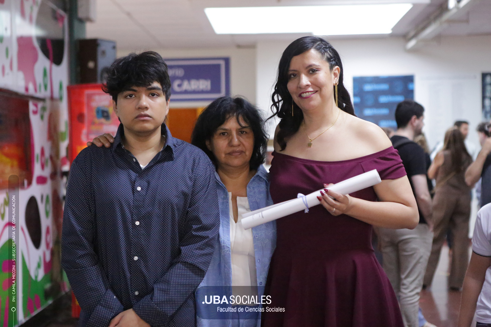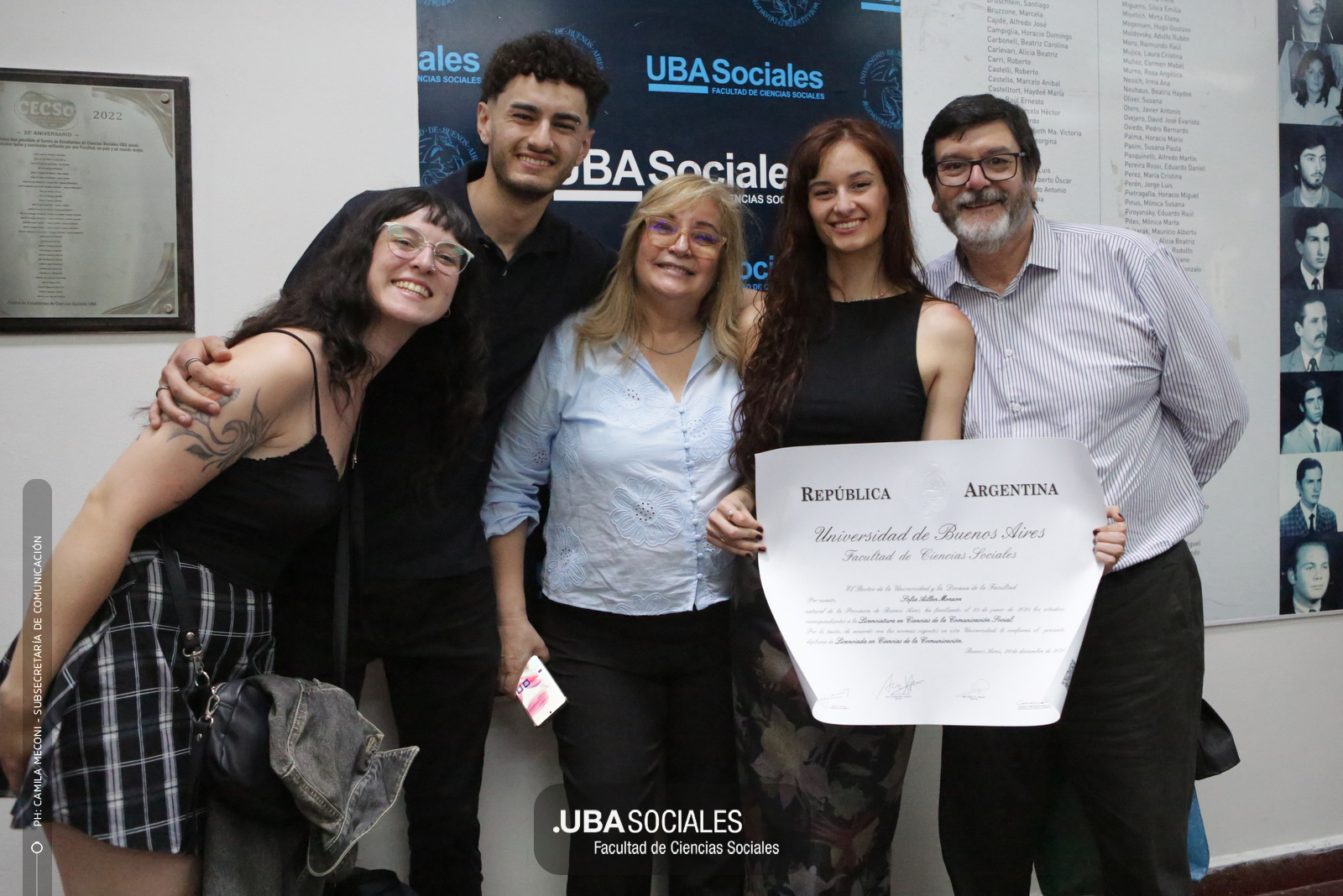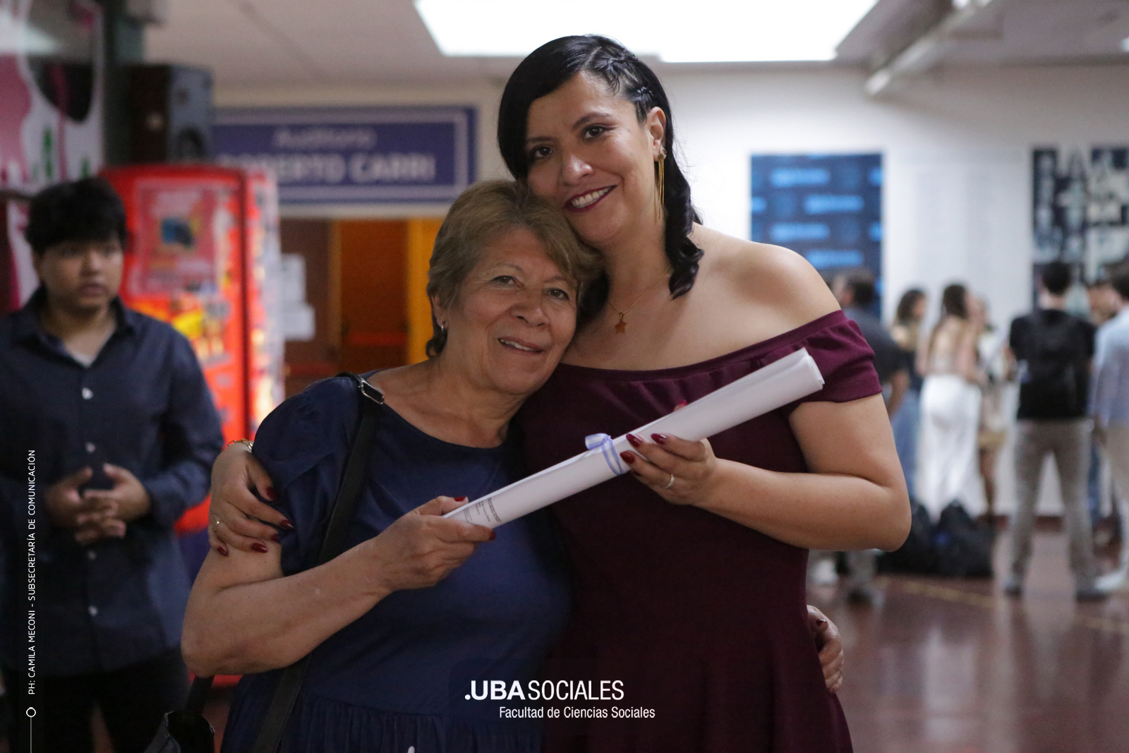 En el escenario la acompañaban el vicedecano Diego de Charras, el secretario académico, Hugo Lewin, la directora de la carrera de Ciencias de la Comunicación, Larisa Kejval, los secretarios académicos de Ciencia Política, Nicolás Zubiría; y de Relaciones del Trabajo, Matías Cao; y su par de Sociología, Sandra Guimenez, y la coordinadora técnica de Trabajo Social, Gisela Mastandrea.