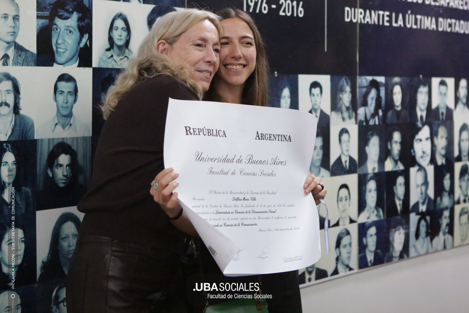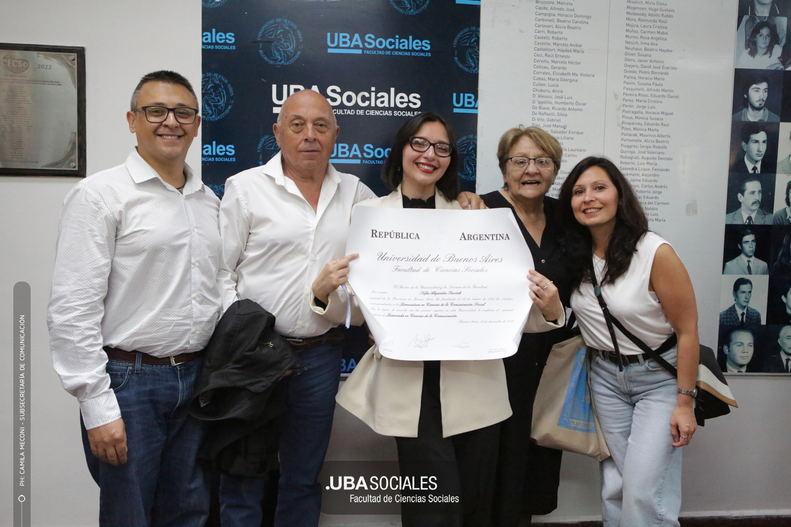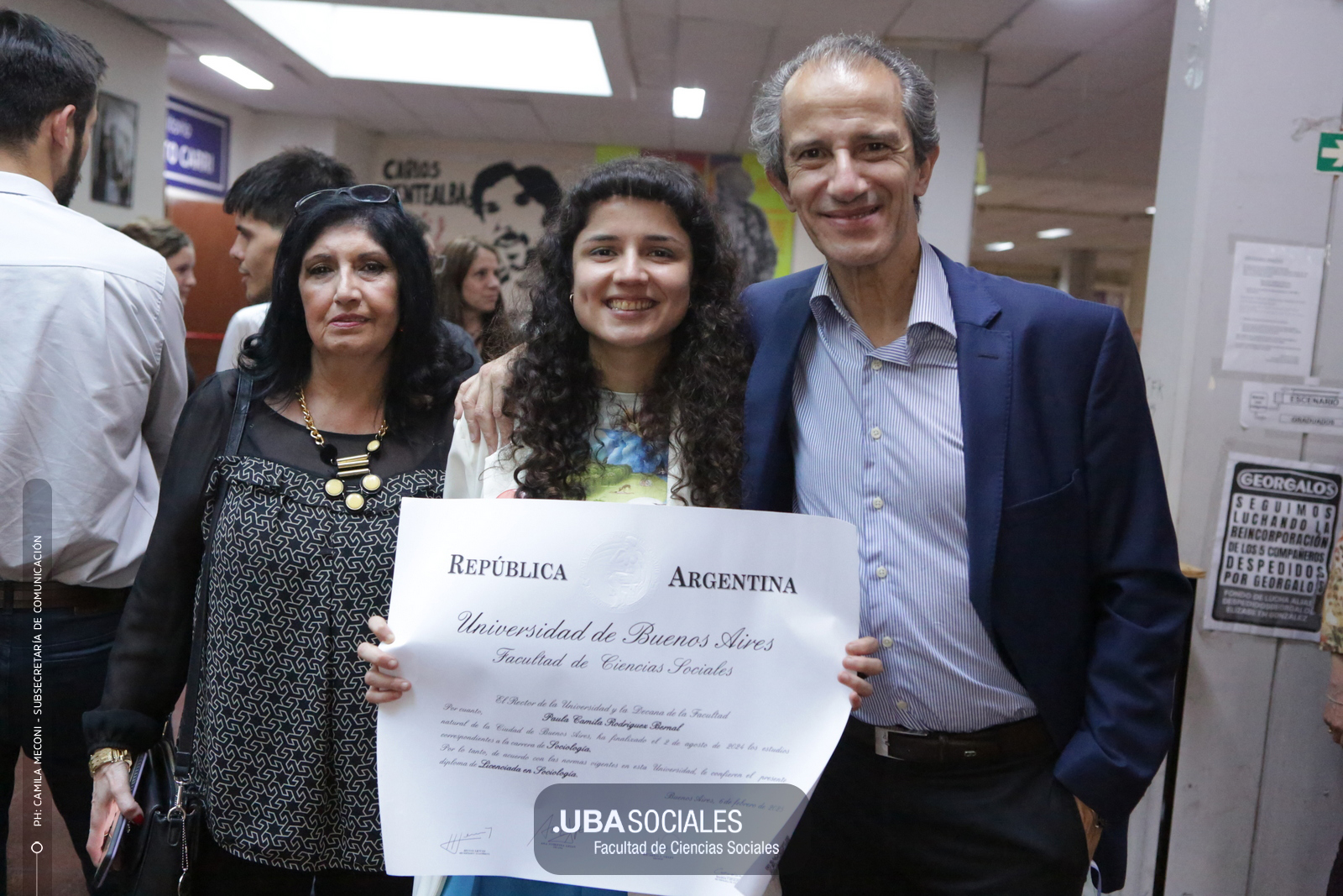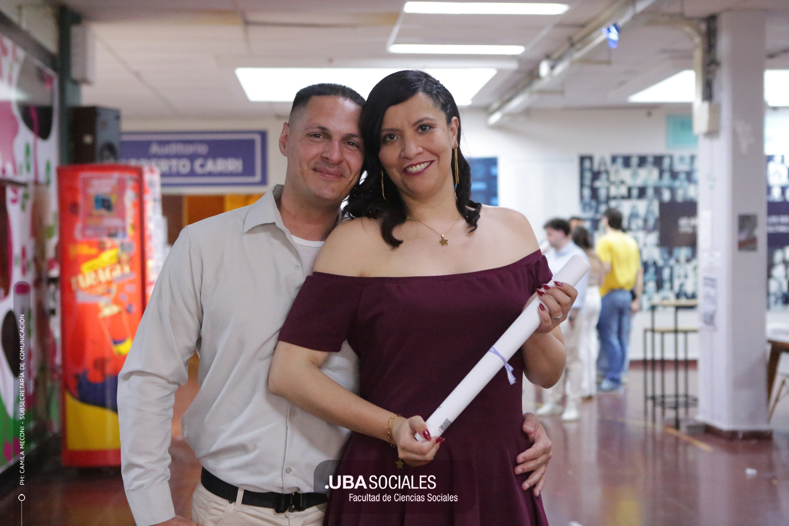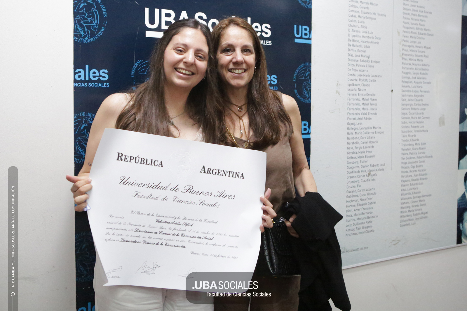 En el escenario la acompañaban el vicedecano Diego de Charras, el secretario académico, Hugo Lewin, la directora de la carrera de Ciencias de la Comunicación, Larisa Kejval, los secretarios académicos de Ciencia Política, Nicolás Zubiría; y de Relaciones del Trabajo, Matías Cao; y su par de Sociología, Sandra Guimenez, y la coordinadora técnica de Trabajo Social, Gisela Mastandrea.