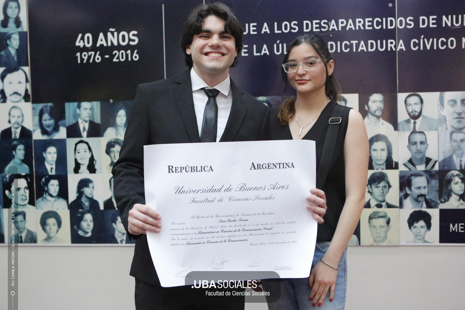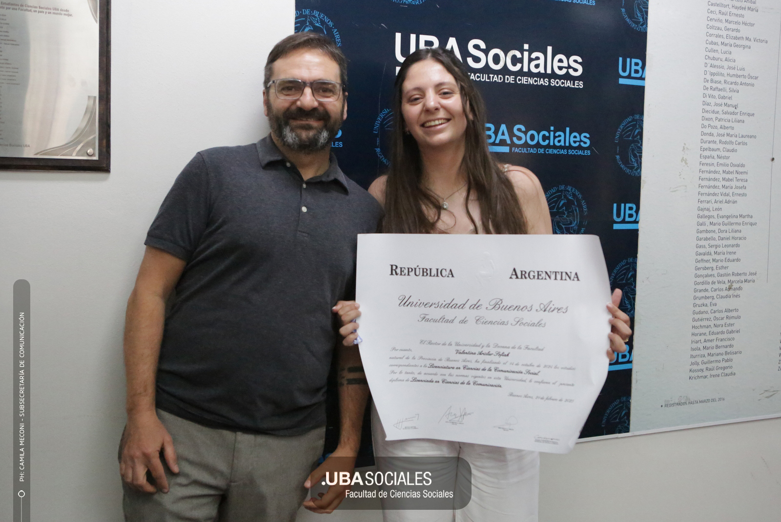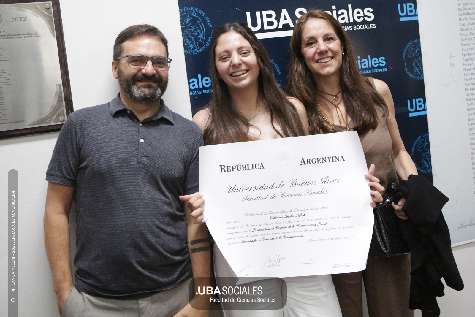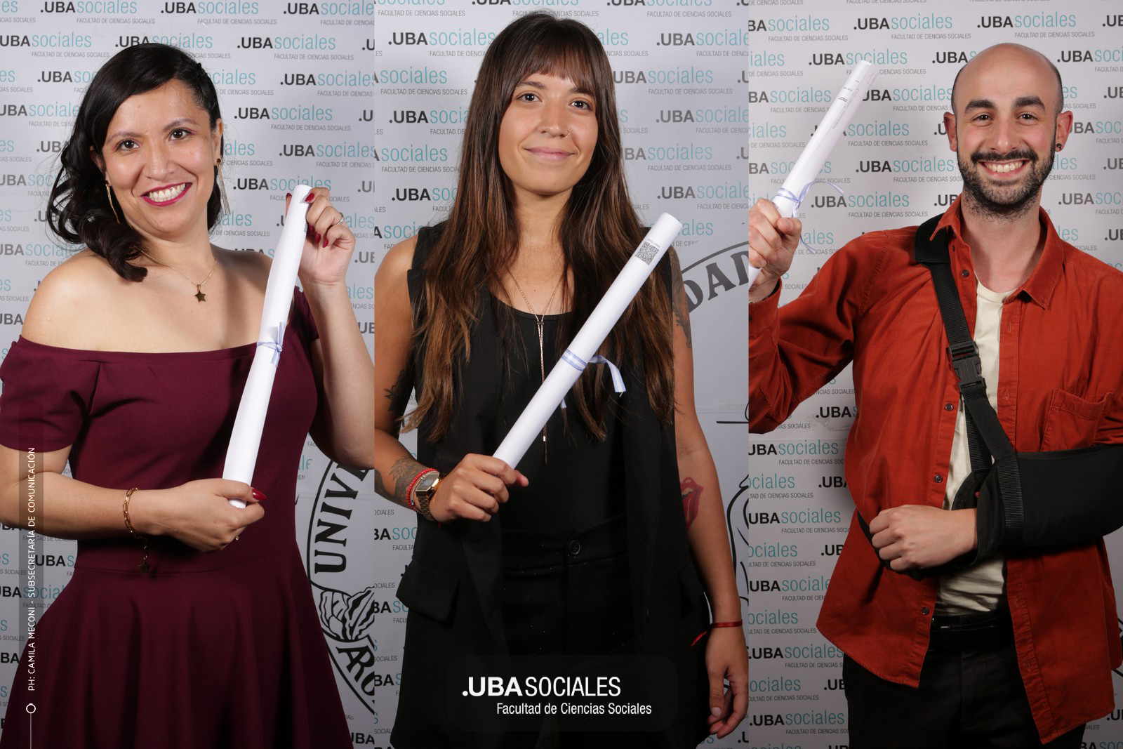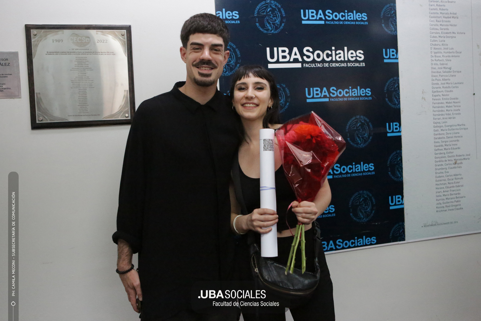 En el escenario la acompañaban el vicedecano Diego de Charras, el secretario académico, Hugo Lewin, la directora de la carrera de Ciencias de la Comunicación, Larisa Kejval, los secretarios académicos de Ciencia Política, Nicolás Zubiría; y de Relaciones del Trabajo, Matías Cao; y su par de Sociología, Sandra Guimenez, y la coordinadora técnica de Trabajo Social, Gisela Mastandrea.