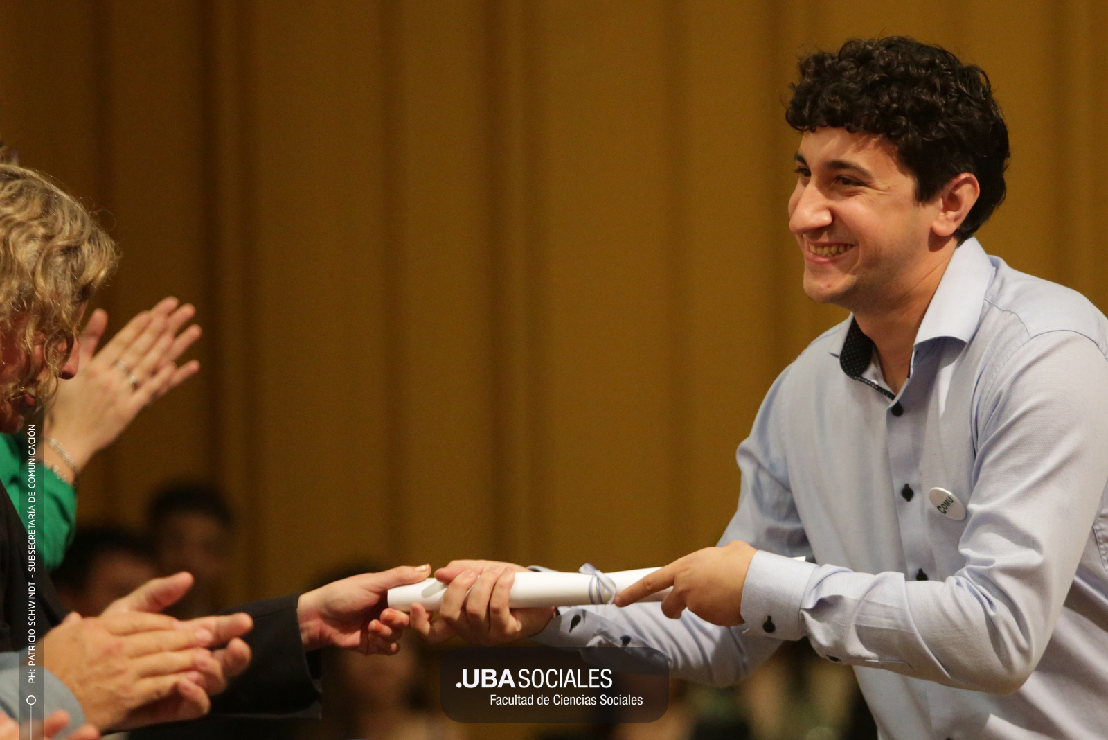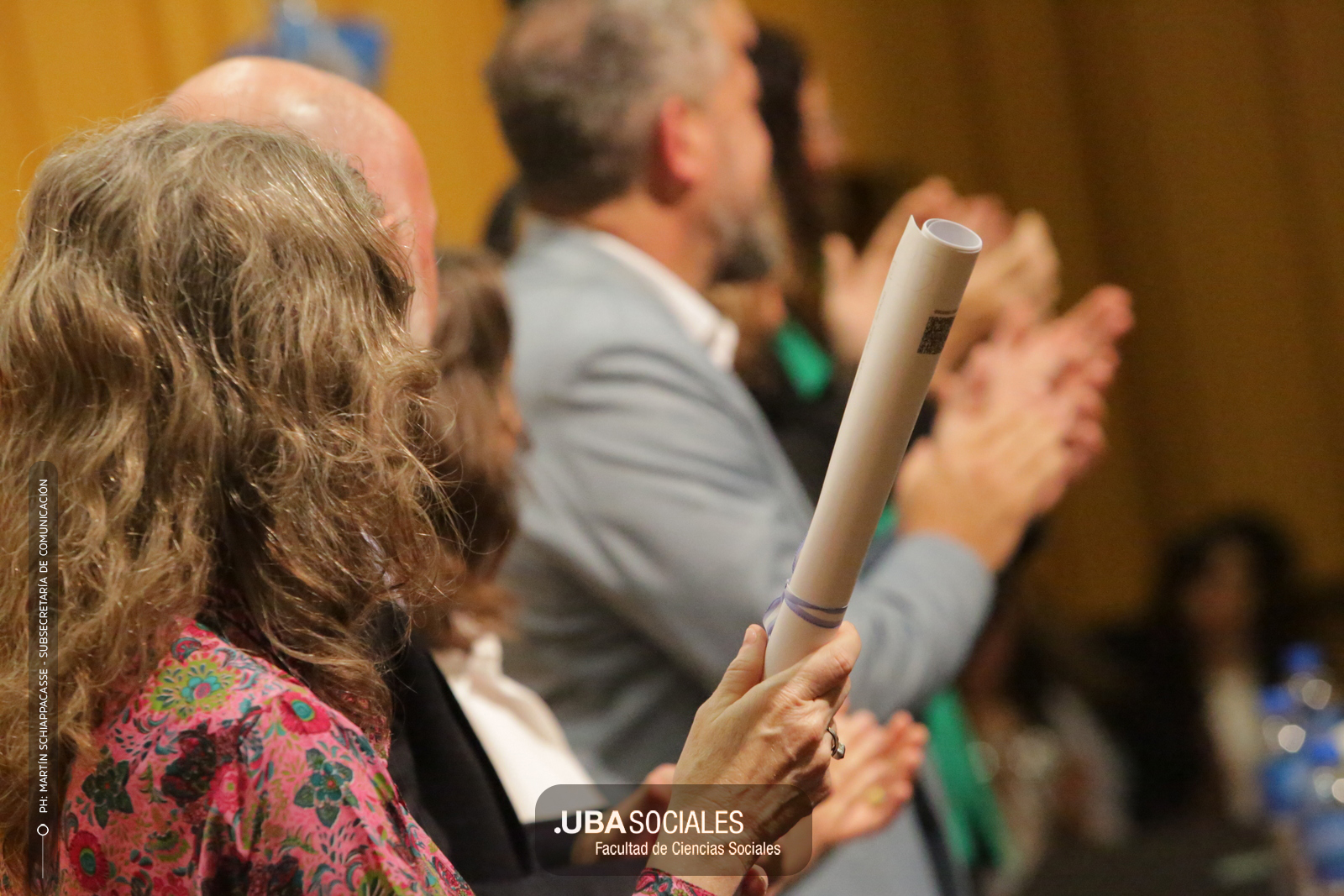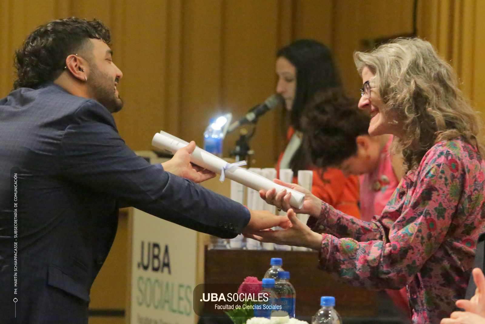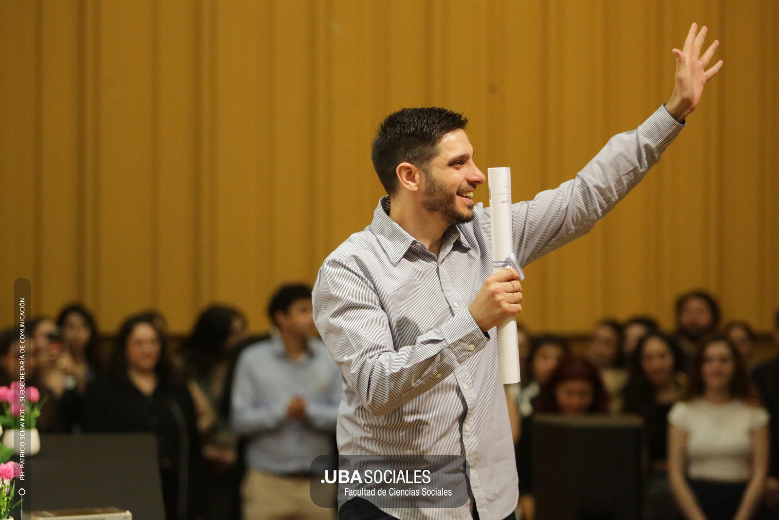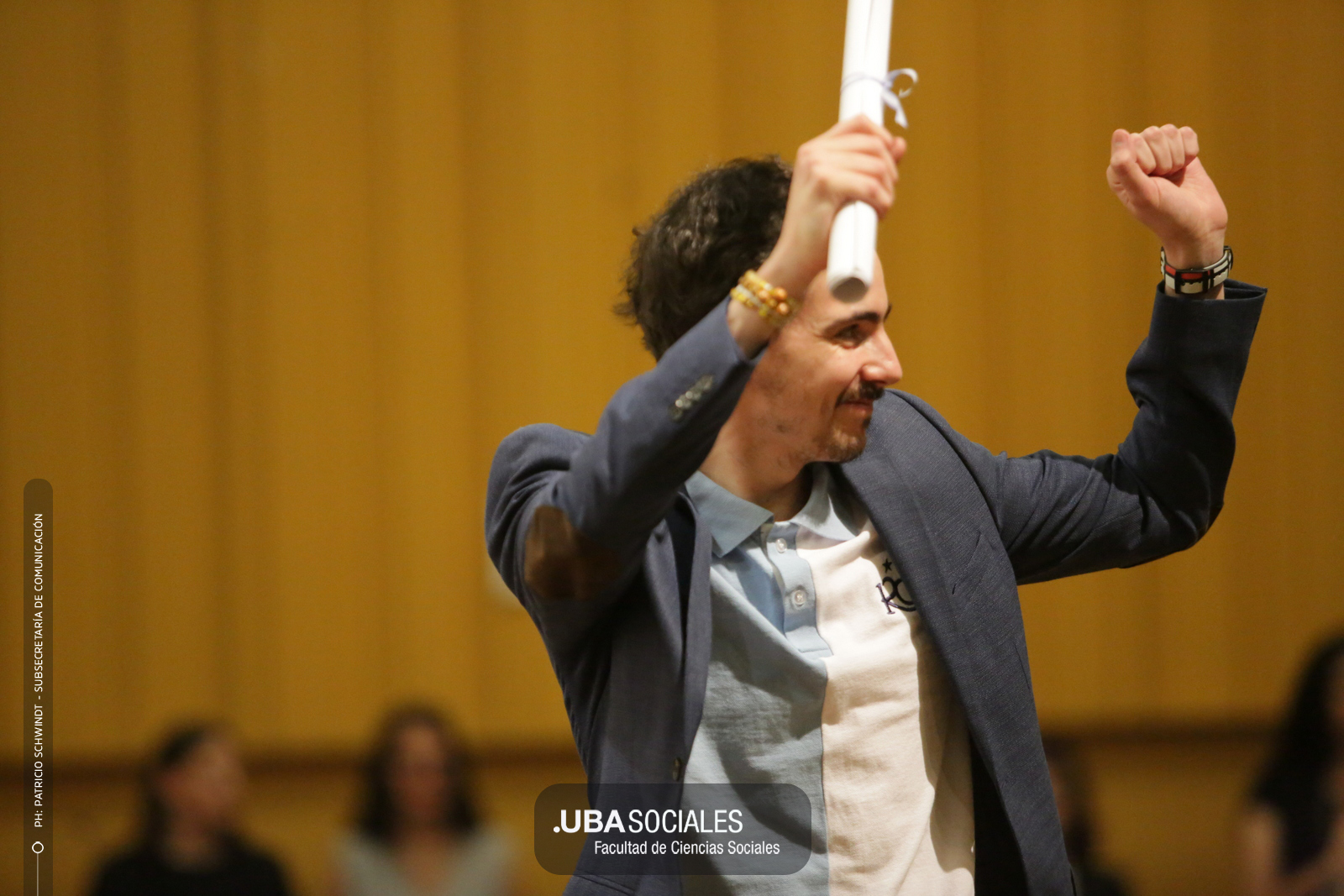 Visiblemente emocionado, explicó que la jura de los flamantes licenciados y licenciadas de una de las cinco disciplinas que se dictan en Sociales se debía al trabajo del área de Títulos pero también al empeño puesto en la reforma del plan de estudios por parte la comunidad académica y el equipo de la carrera de Ciencias de la Comunicación. De Charras expresó, además, «el saludo y las felicitaciones» de la decana Ana Arias y las autoridades de la Facultad.