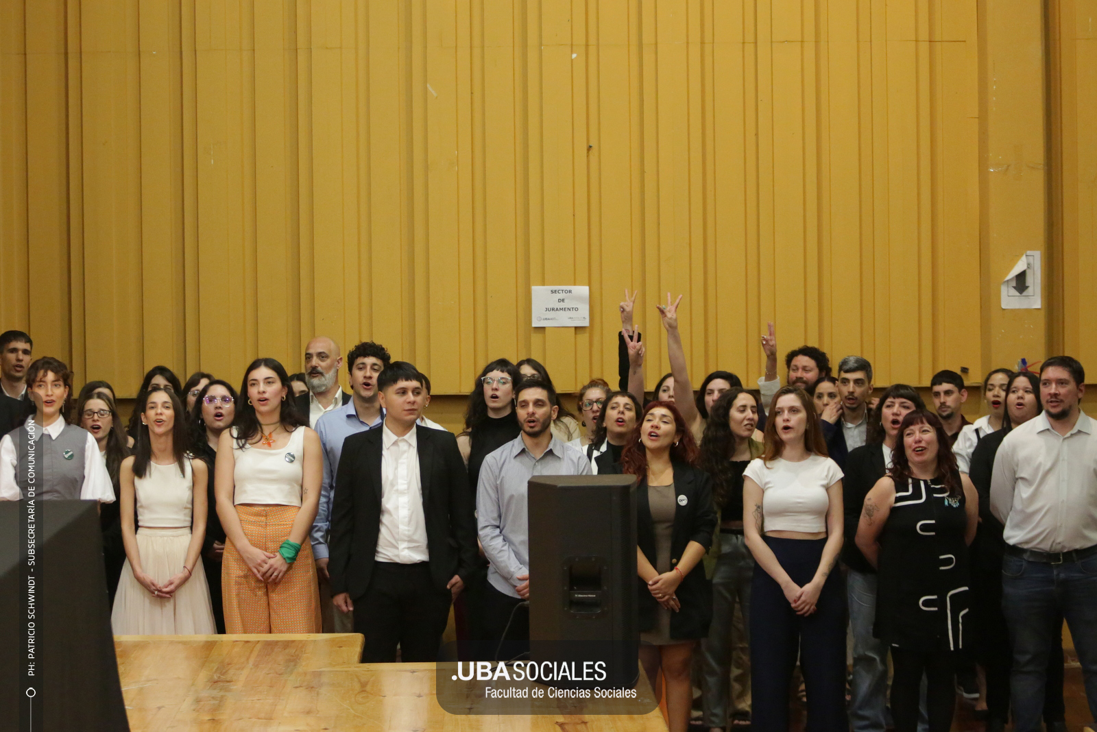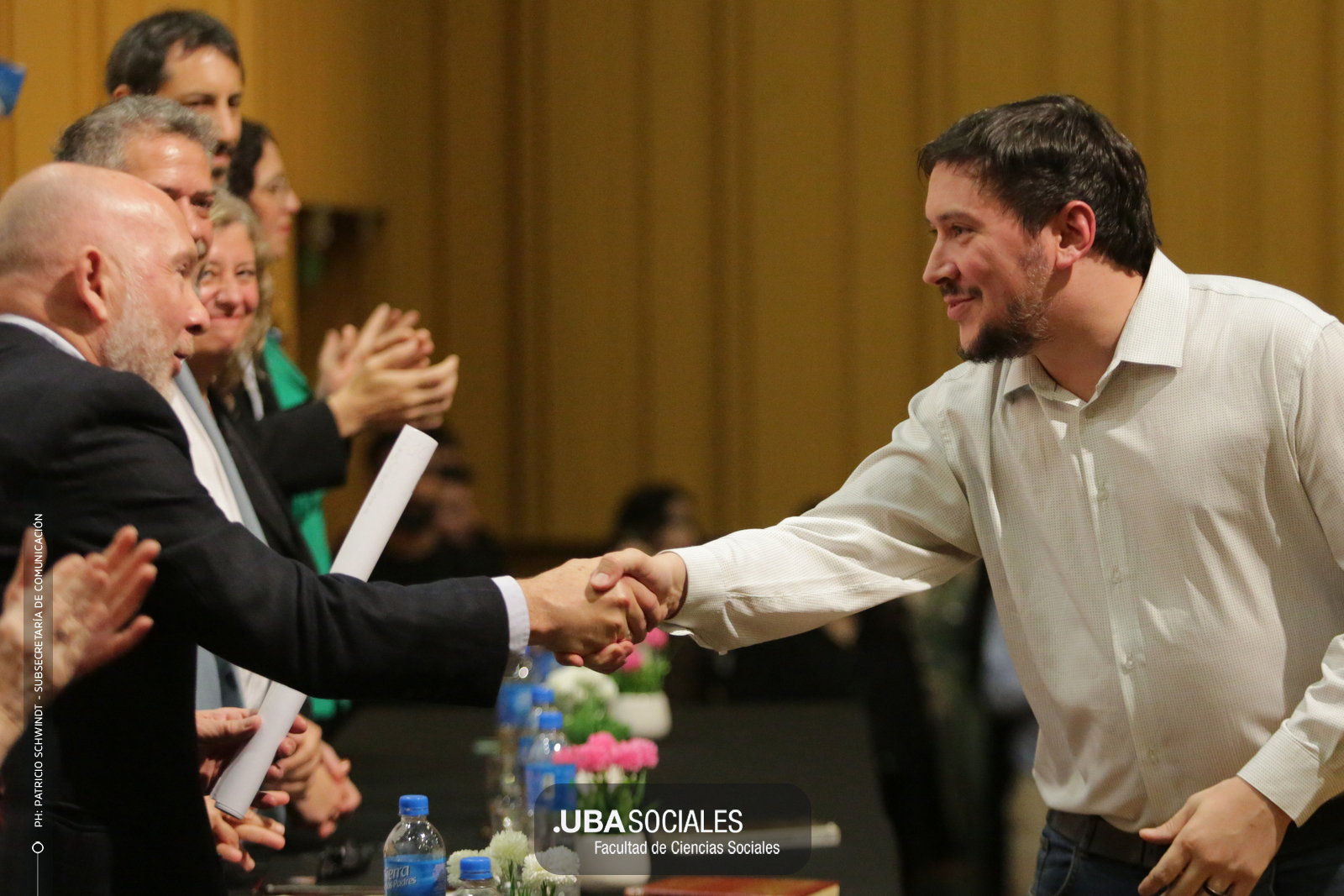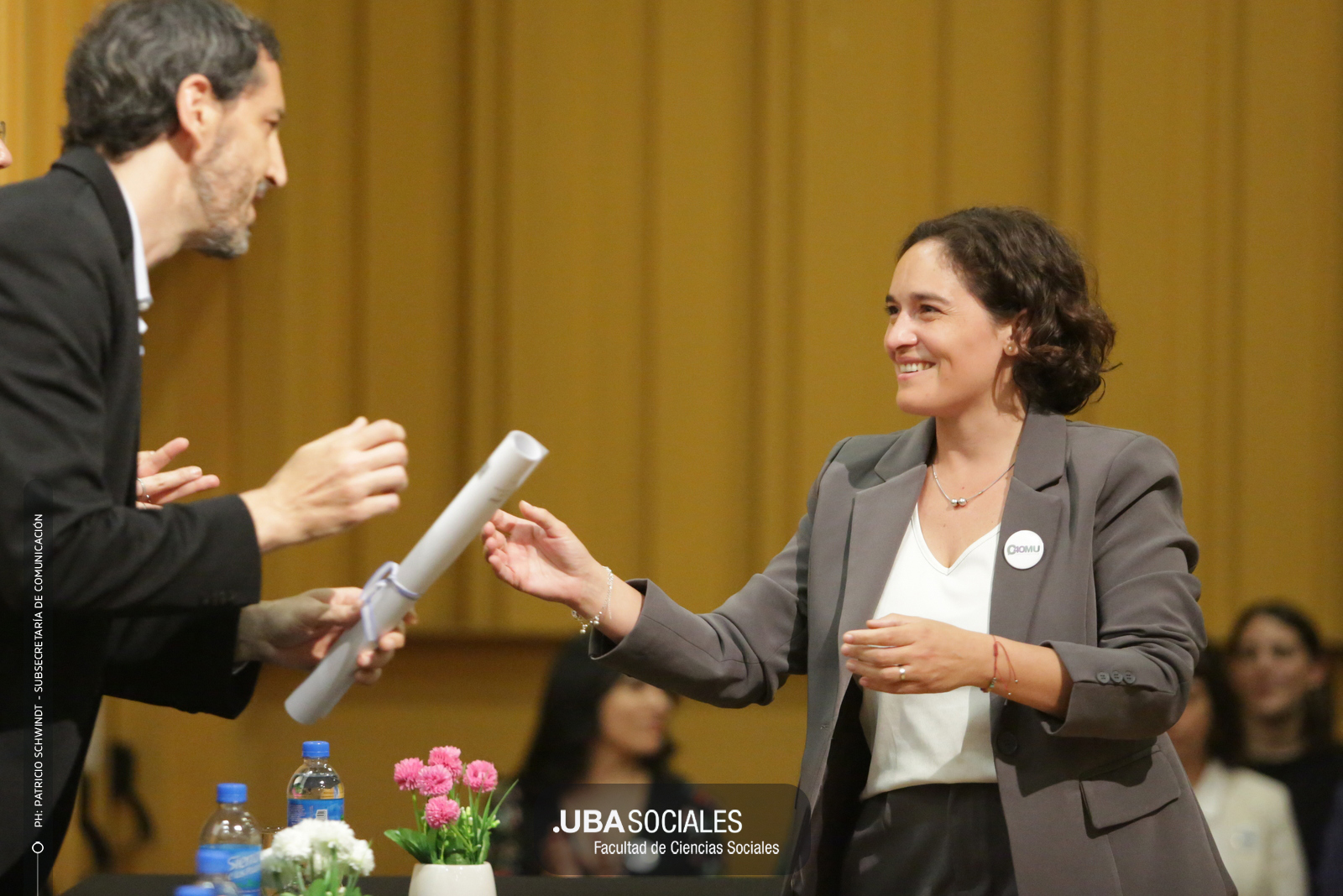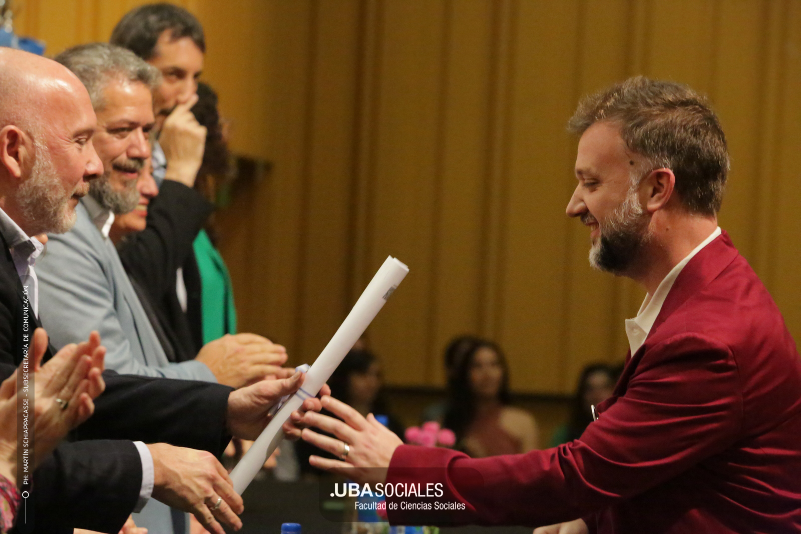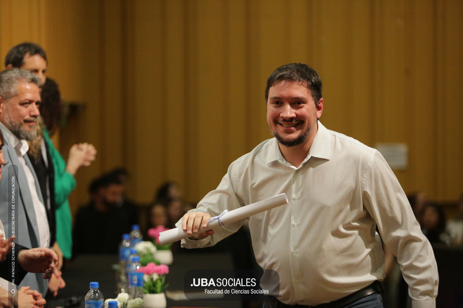 Visiblemente emocionado, explicó que la jura de los flamantes licenciados y licenciadas de una de las cinco disciplinas que se dictan en Sociales se debía al trabajo del área de Títulos pero también al empeño puesto en la reforma del plan de estudios por parte la comunidad académica y el equipo de la carrera de Ciencias de la Comunicación. De Charras expresó, además, «el saludo y las felicitaciones» de la decana Ana Arias y las autoridades de la Facultad.