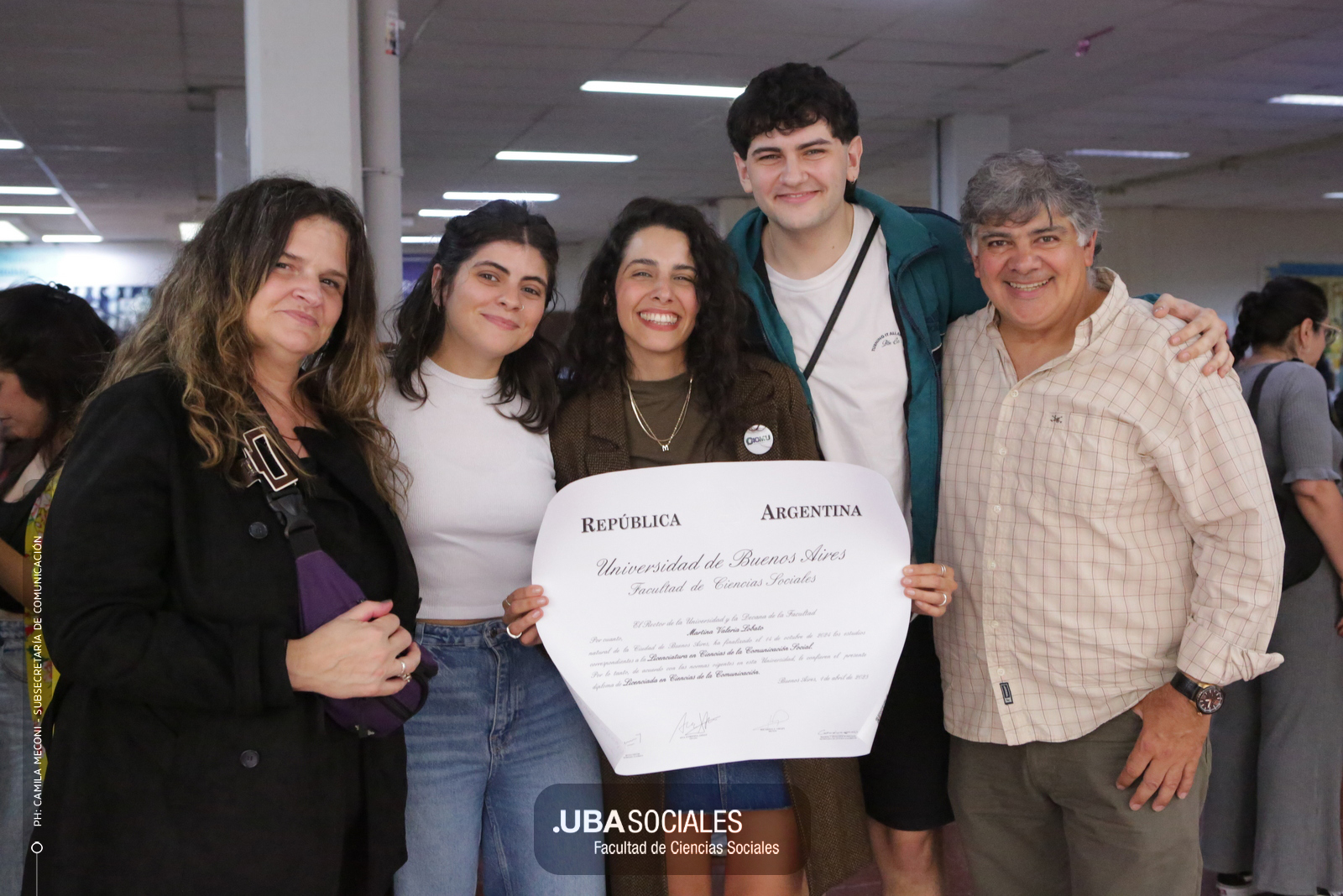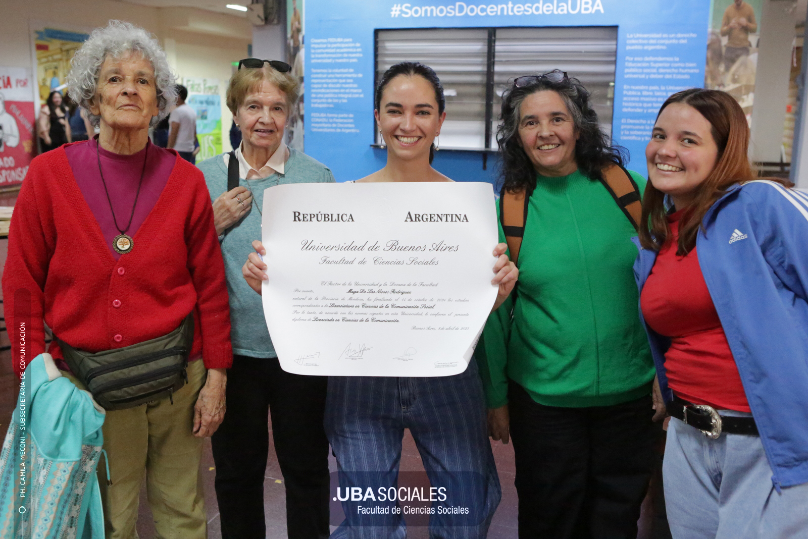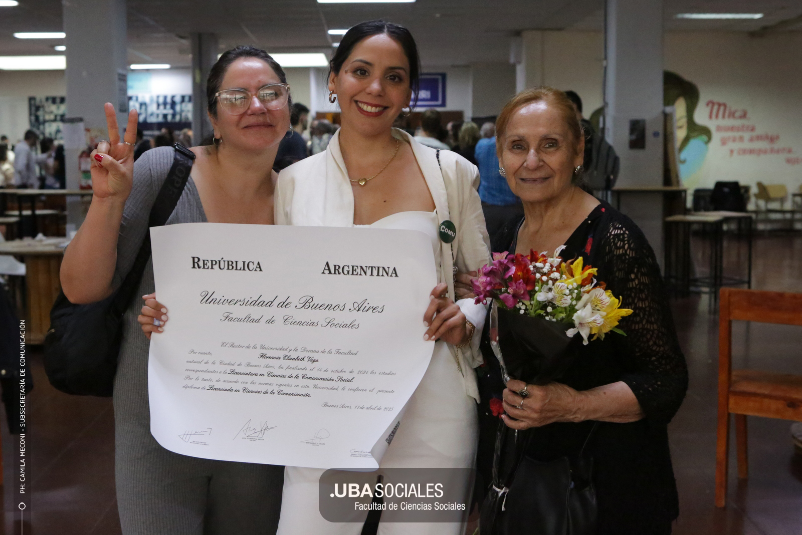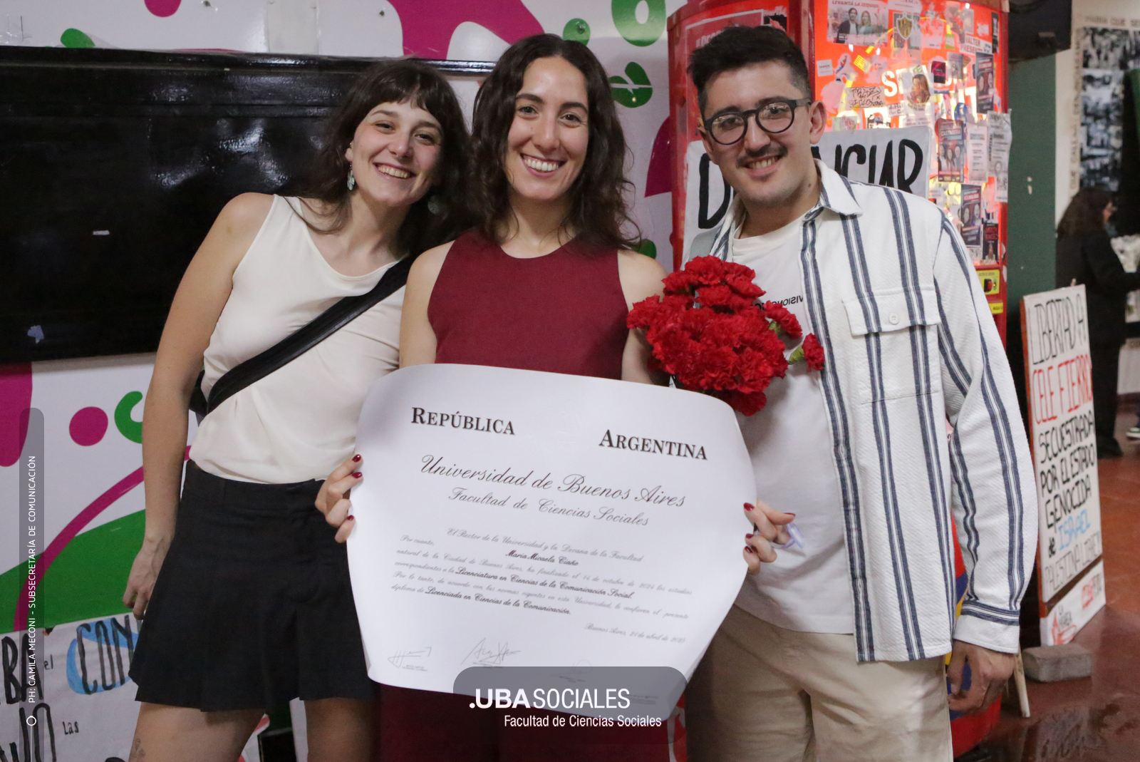 Luego, expresó: «Todo converge acá. Nos encontramos con la conciencia plena de que nadie lo hizo solo». «La universidad pública nos cambió la vida, nos llena de orgullo decir que somos licenciados y licenciadas de Ciencias de la Comunicación de la Facultad de Ciencias Sociales de la UBA», agregó.